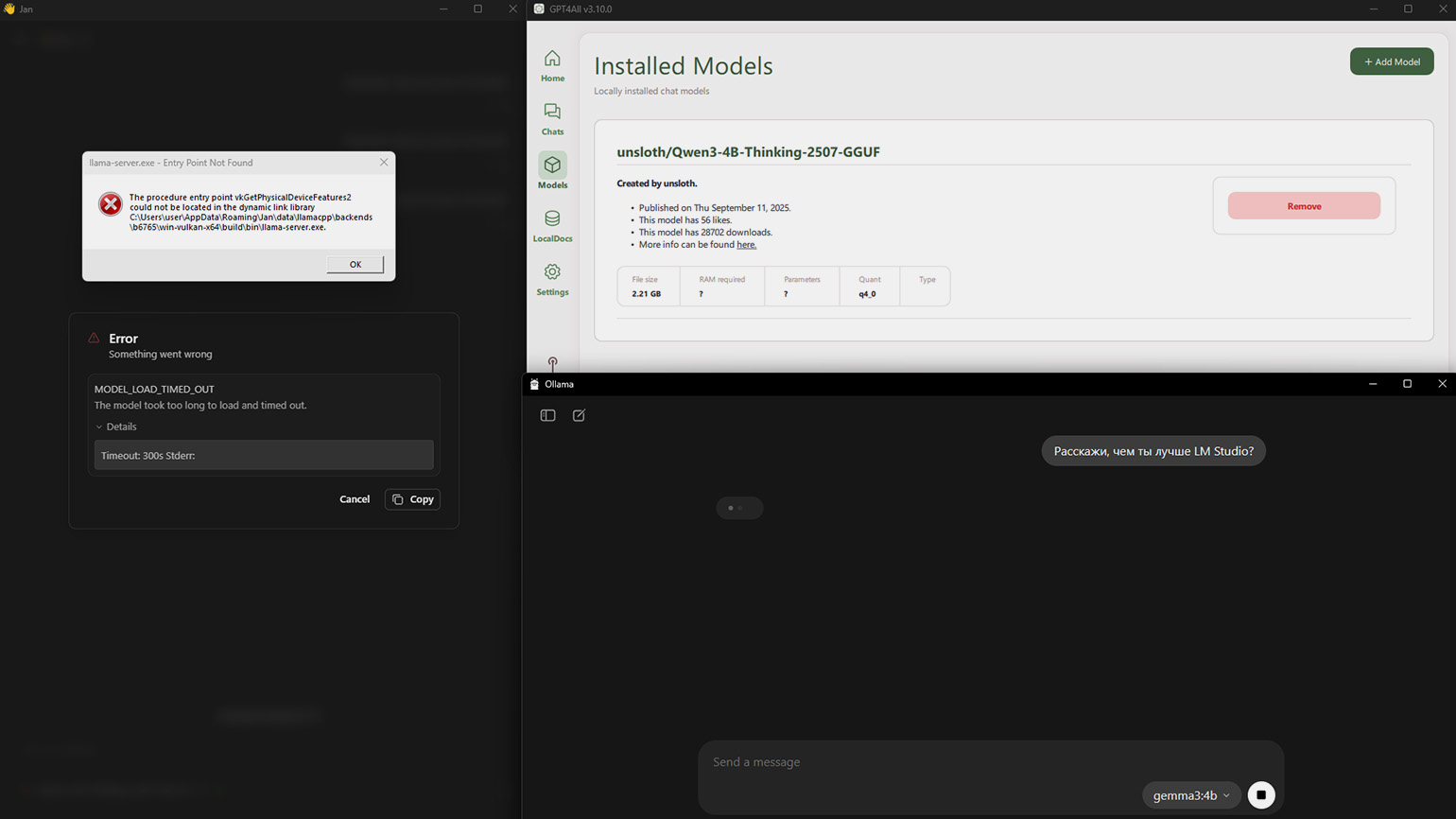 Однако ничего не вышло. Мы без проблем установили Qwen 3 в GPT4All и Jan, но обе программы выдавали ошибку при попытке получить ответ. В каталоге Ollama нужной модели не оказалось, поэтому мы скачали базовую gemma3:4b, которая зависла при первом запуске.