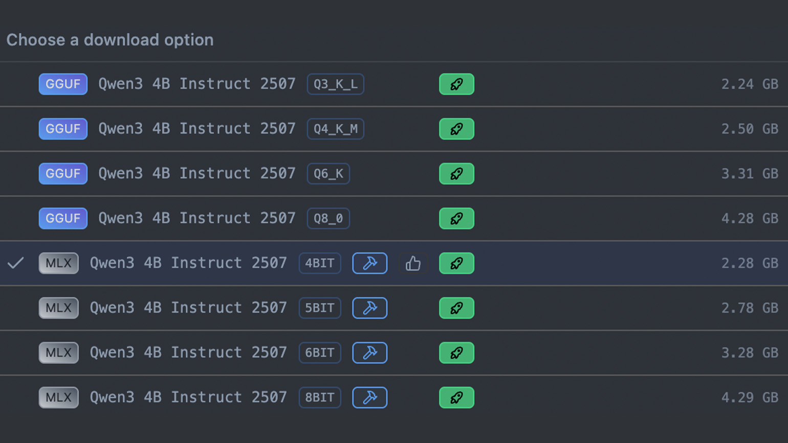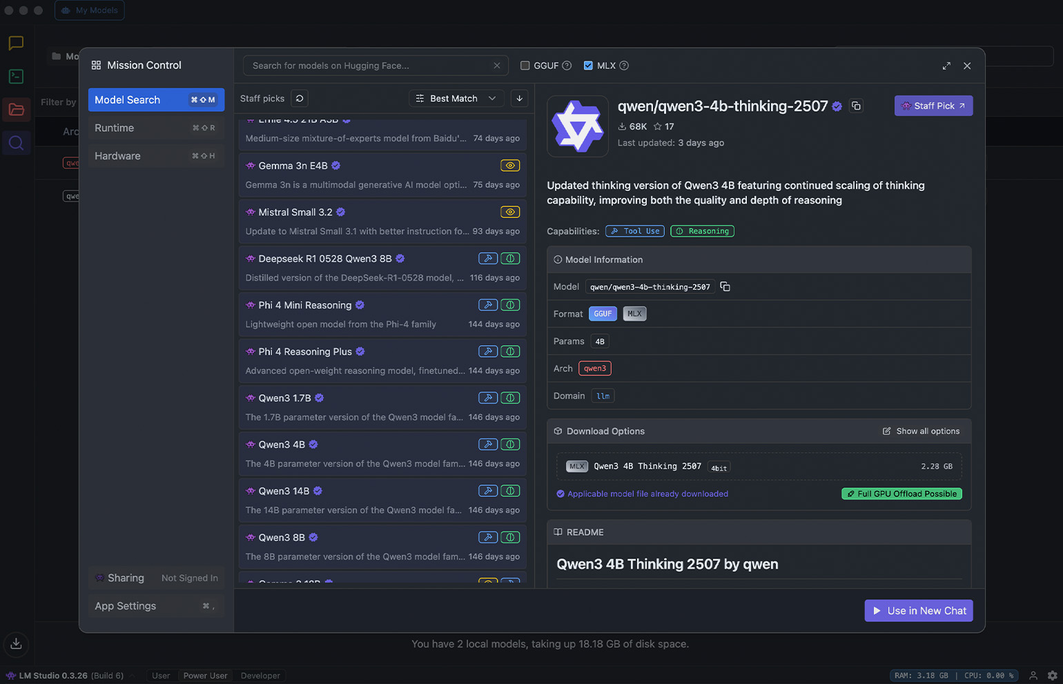 Введите в поиске Qwen3-4b-thinking-2507. Если у вас macOS, то в списке версий выберите формат MLX, для других ОС — GGUF. Затем нажмите Download, дождитесь загрузки и кликните на Use in New Chat.
