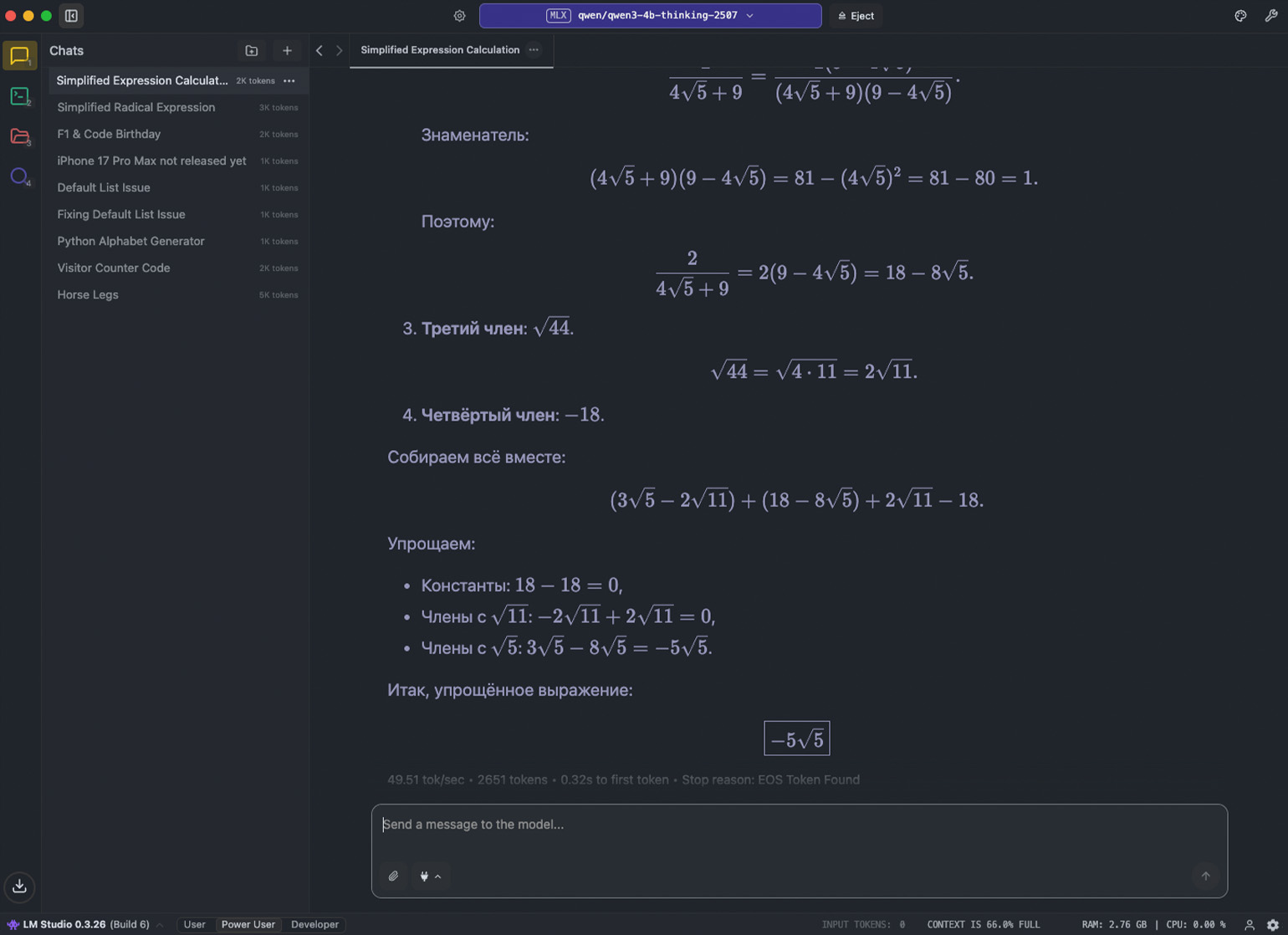 К сожалению, Qwen 3 не умеет распознавать изображения. Поэтому мы конвертировали запись в LaTeX-формат и отправили её в таком виде: \sqrt{(2\sqrt{11}-3\sqrt{5})^{2}}+\frac{2}{4\sqrt{5}+9}+\sqrt{44}-18.