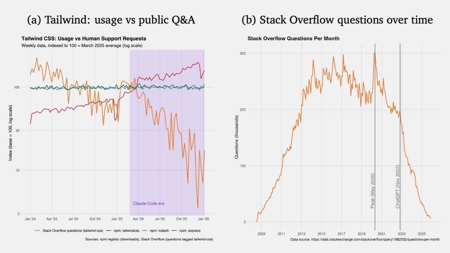 Дело в том, что нейросети генерируют код напрямую, поэтому трафик на официальную документацию Tailwind упал на 40% по сравнению с 2023 годом. Вместе с падением трафика сократился приток клиентов на коммерческие продукты — это напрямую ударило по доходам проекта.