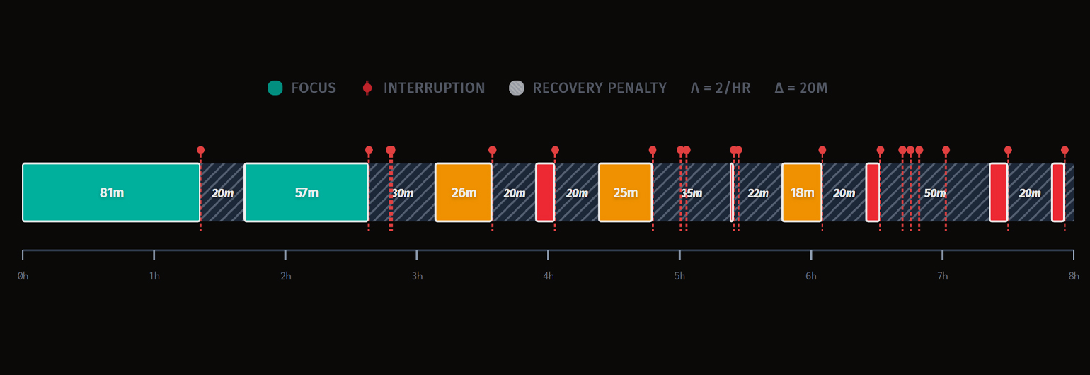 Модель показывает, что фокус нарушает не само отвлечение, а время на возврат к работе. При каждом переключении мозг тратит на восстановление контекста больше времени, чем длится отвлечение. В результате день заполняется безобидными микропереключениями, которые разрушают глубокое погружение в работу.