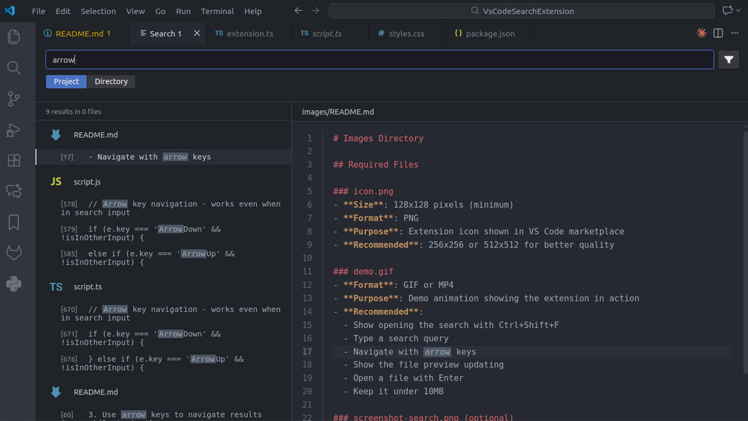 Главная фишка Storm Search — навигация с клавиатуры работает прямо во время набора запроса. Стрелками вы можете листать результаты, не отрываясь от поля ввода. Enter открывает файл на нужной строке, а модификаторы вроде Ctrl + Enter или Shift + Enter позволяют перейти в новую вкладку или в сплит-режим, не закрывая окно поиска. Также доступна фильтрация по типам файлов (*.ts, *.js) и поиск внутри конкретных директорий через контекстное меню в Explorer.