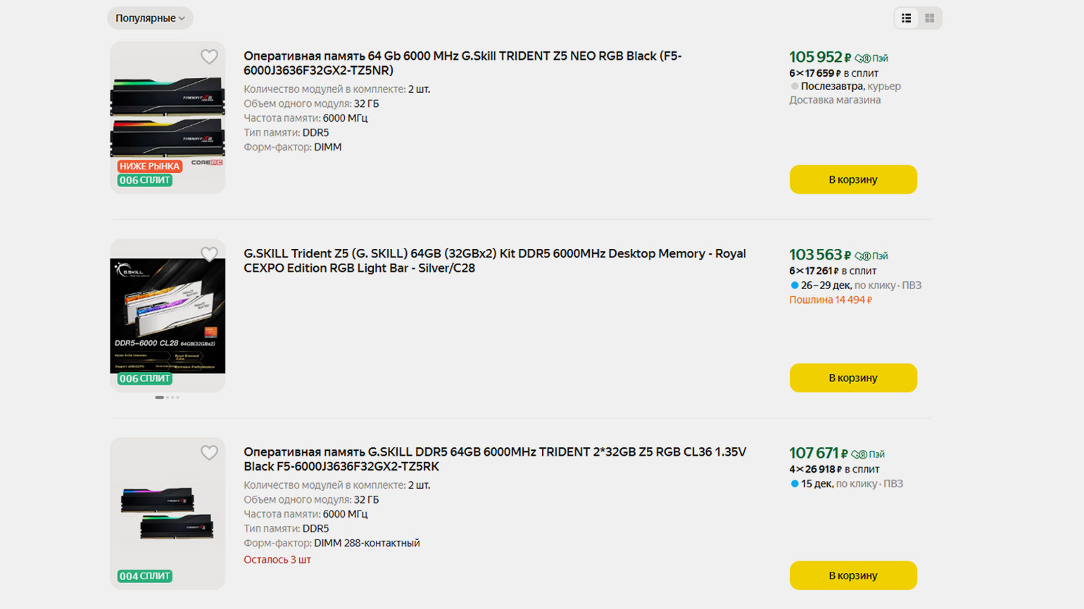 Цены на модули оперативной памяти резко выросли: DDR5 подорожала на 190% с конца сентября. Например, популярный комплект G.Skill Trident Z5 Neo (64 ГБ, 6000 МГц) стоил в сентябре 220 долларов, а к концу ноября — 640 долларов.