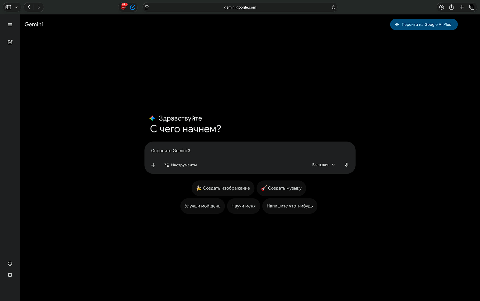 Шаг 1. Откройте любой браузер, войдите в Google-аккаунт и перейдите на сайт gemini.google.com. Если аккаунта нет — его придётся создать.