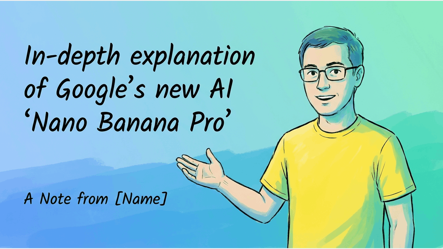 Completely recreate the uploaded person.Make it a header image for a note article where that person introduces [Nano Banana Pro].Aspect ratio: horizontal 16:9.Style and colors: simple, hand-drawn style, italic, with a [blue and green] gradient.Title text: [In-depth explanation of Google’s new AI ‘Nano Banana Pro].