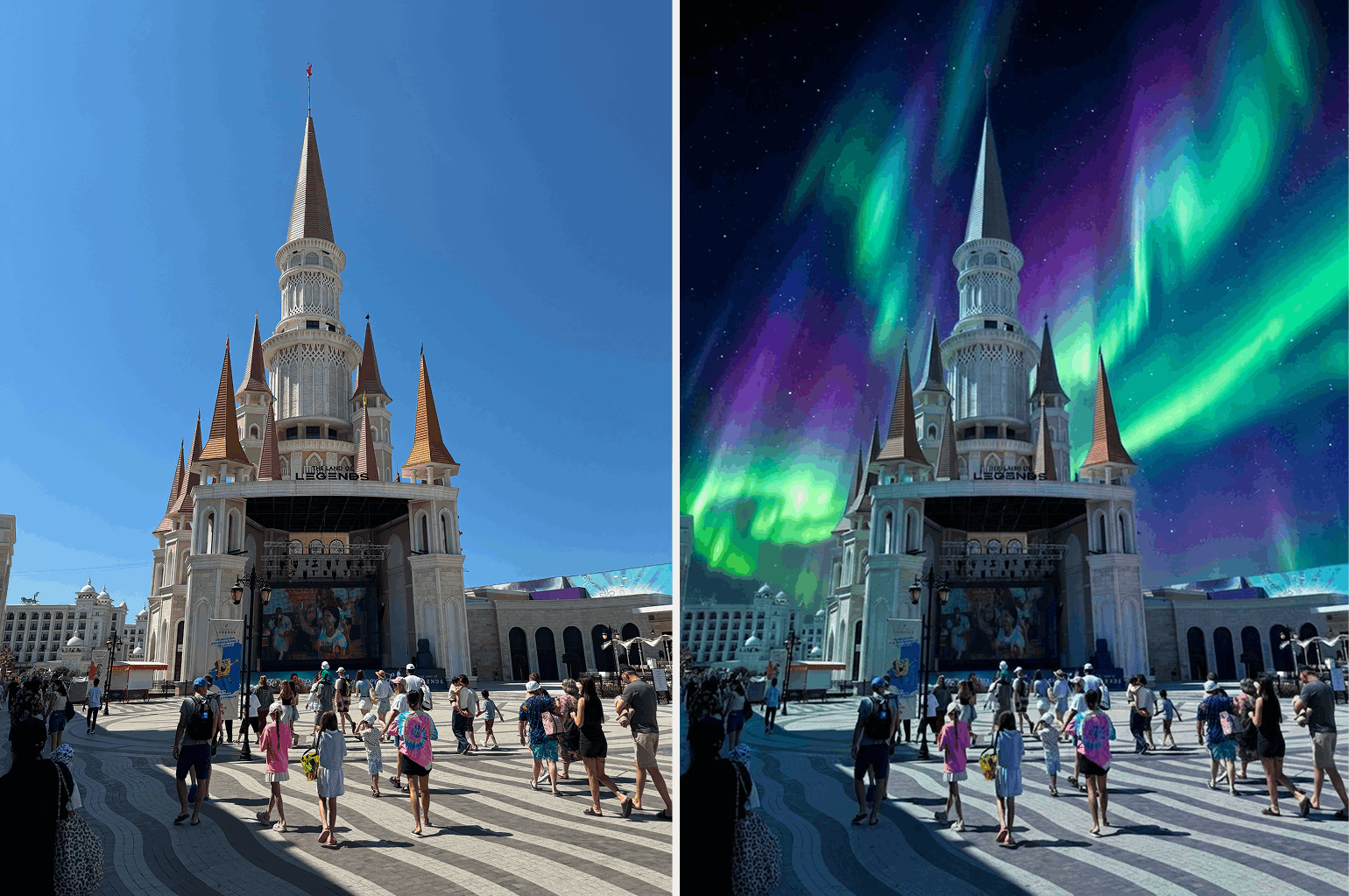 Скучный фон можно заменить на что угодно — просто опишите нужный результат или отправьте в чат референс. Для примера превратим летнюю фотографию в северную сказку. Получилось волшебно, только следующим промптом можно попросить переодеть людей по погоде :)