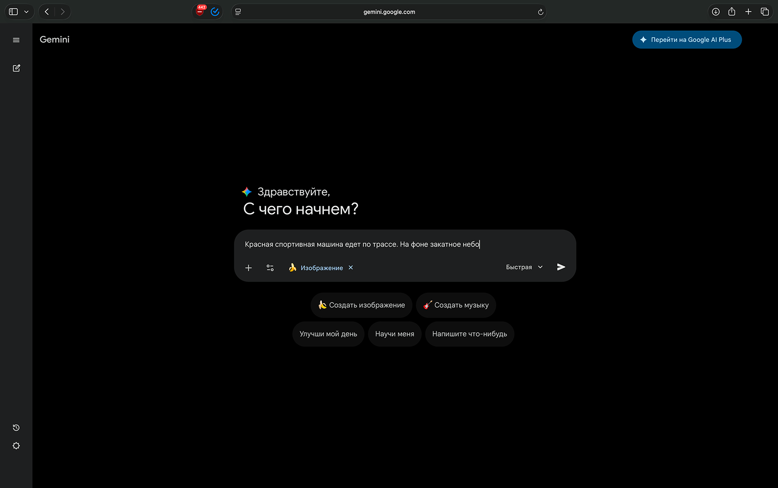 Поле ввода с активным режимом «Изображение» и промптом «Красная спортивная машина едет по трассе. На фоне закатное небо»