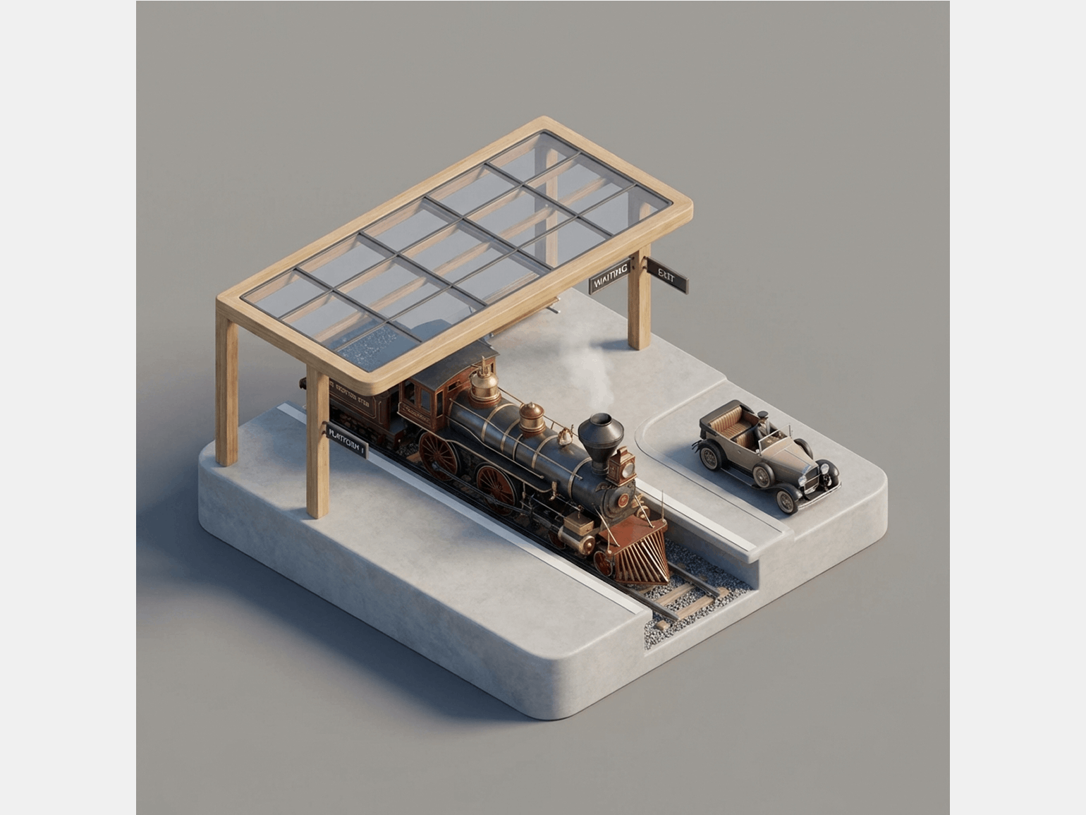 Nano Banana создала аккуратную 3D-сцену в стиле архитектурного макета. На ней есть крытая платформа со стеклянным навесом, указатели Waiting и Exit, железнодорожные пути с паровозом и стильный ретроавтомобиль, припаркованный рядом с перроном. Всё выполнено с мягким студийным освещением и неплохо детализировано.