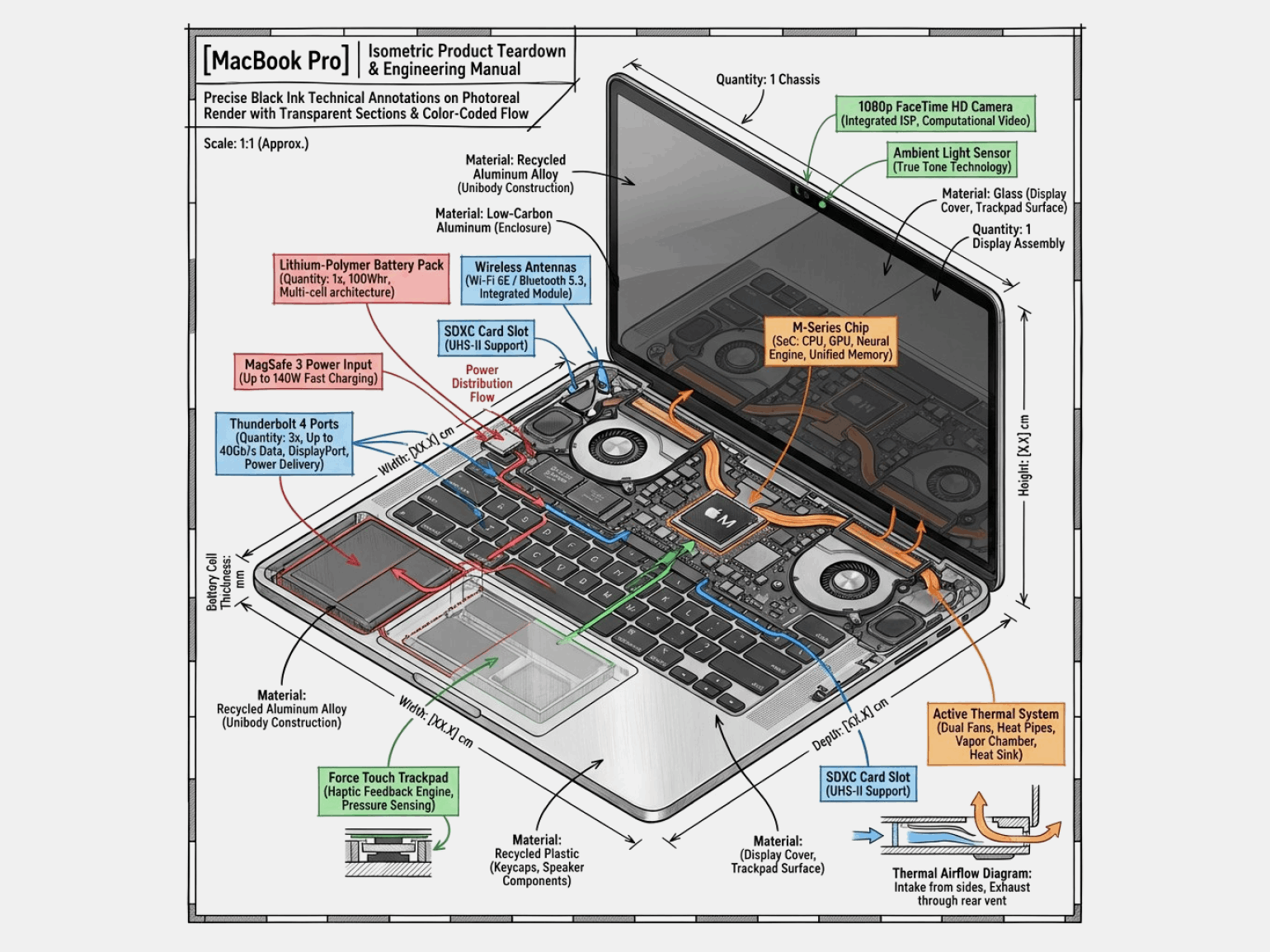 — Key component labels with color-coded callout boxes– Internal component visibility through transparent/cutaway sections– Measurements, dimensions, and precise scale markers– Material callouts and quantities– Color-coded arrows for function/flow: RED (power/battery), BLUE (data/connectivity), ORANGE (thermal/processor), GREEN (sensors/haptics) — Simple schematics or cross-sectional diagrams where relevant. Place [MacBook Pro] title in a hand-drawn technical box (top-left corner).