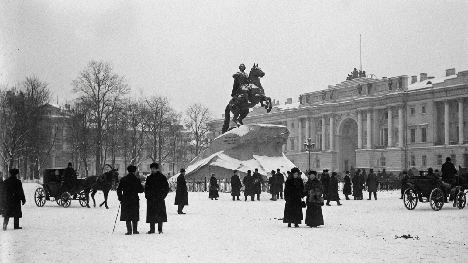 В ответ нейросеть выдала чёрно-белую сцену с Медным всадником, конными экипажами и прохожими в одежде начала XX века. Если не знать про генерацию, можно легко поверить в подлинность этого фото.