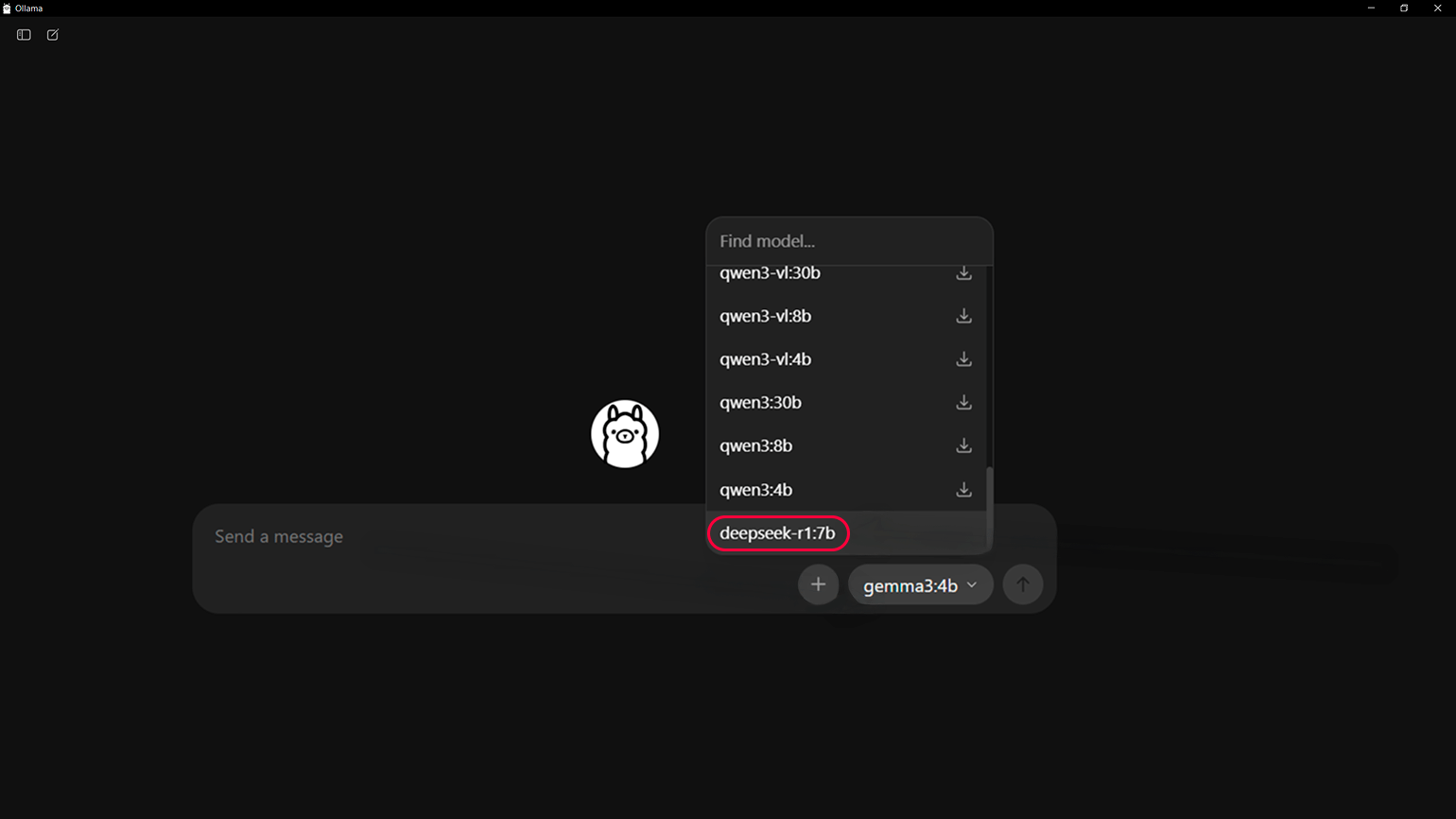 - После установки открыть терминал и выполнить команду для загрузки модели. Например, чтобы загрузить deepseek-r1:7b, введите: ollama pull deepseek-r1:7b.