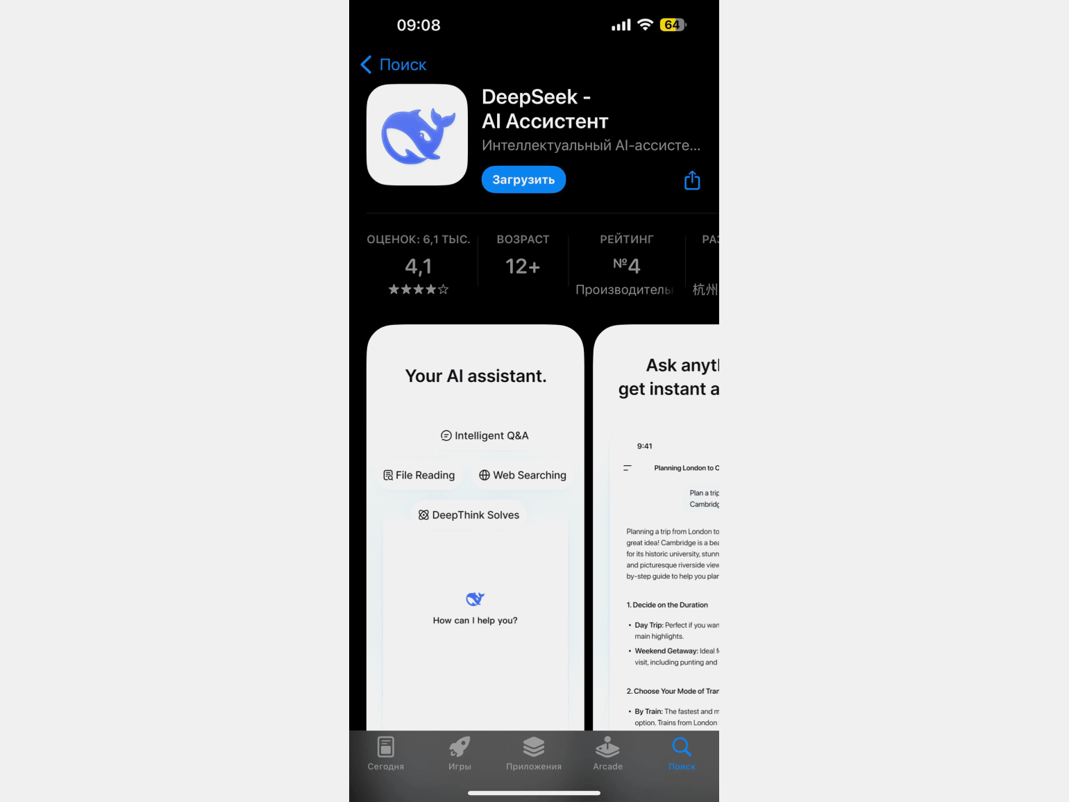 К нейросети также можно получить доступ через мобильное приложение DeepSeek — AI Assistant. Оно доступно для Android в Google Play и для iOS в App Store. Рассмотрим процесс установки на примере iPhone: