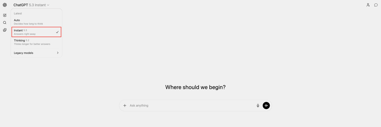 Чтобы попробовать GPT-5.3 Instant, откройте меню выбора модели и кликните на Instant 5.3.