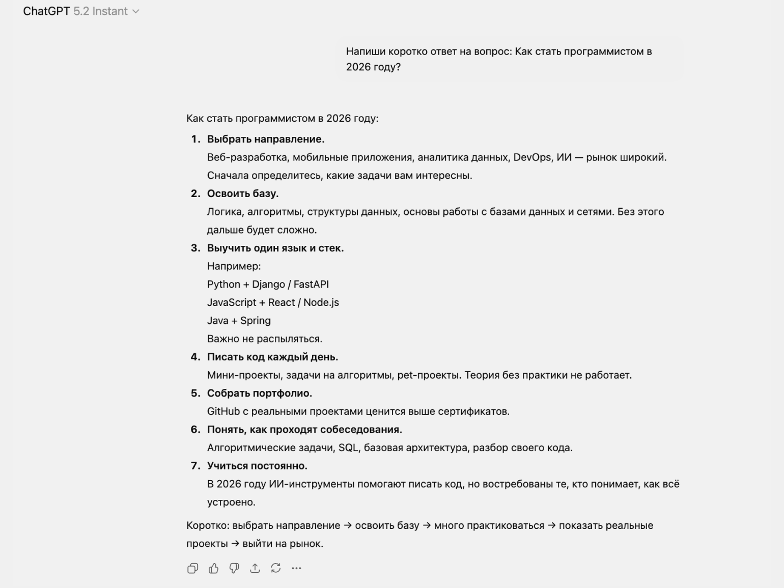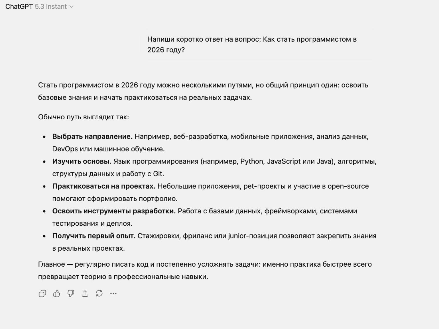 Попробуем сравнить ответы GPT-5.3 Instant и предыдущей модели на один и тот же вопрос. Для этого используем промпт: «Напиши коротко ответ на вопрос: Как стать программистом в 2026 году?»