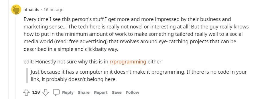 «Каждый раз, когда вижу проекты этого парня, я всё больше и больше поражаюсь его бизнесовой и маркетинговой чуйке… Технология тут не новая и не какая-то необычная! Но парень действительно знает, как с минимальными усилиями завируситься в соцсетях (читай: бесплатная реклама), — а люди помешаны на ярких, цепляющих глаз проектах, которые можно описать просто и с использованием кликбейта».
