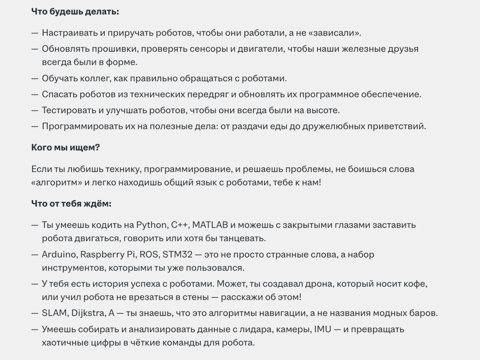 Набор компетенций робототехника получается обширным, поскольку эта профессия объединяет хард-скиллы механика, разработчика и электронщика. При этом конкретный перечень навыков сильно варьируется в зависимости от типа компании и специфики реализуемых проектов.