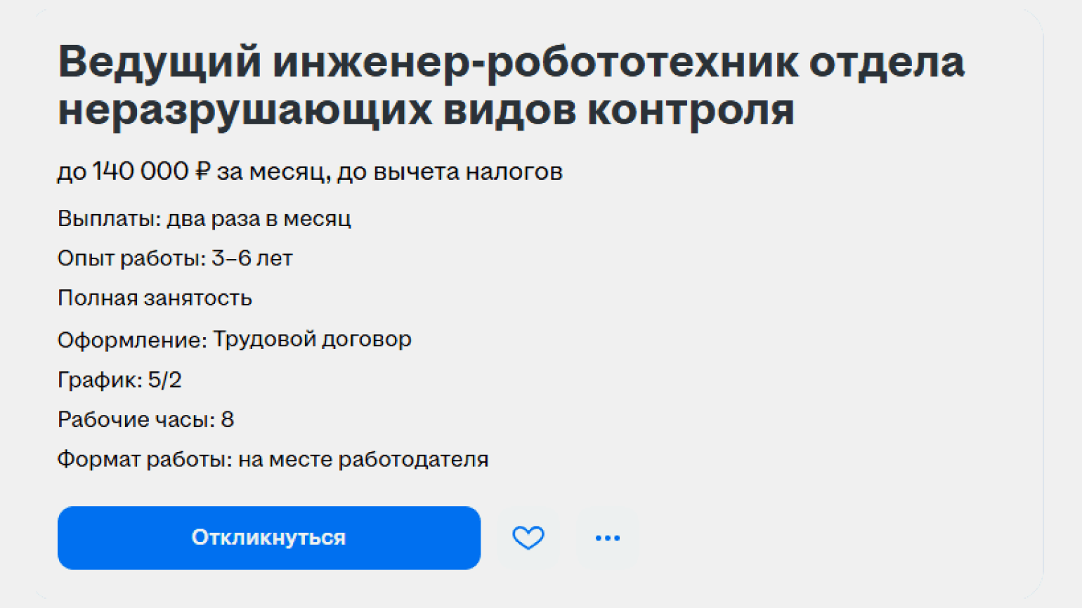 Средний уровень заработной платы инженера-робототехника — 90 442 рубля в месяц. При этом разброс зарплат между отдельными вакансиями существенный. В марте 2026 года на HeadHunter можно было найти предложения с вилкой от 50 тысяч до 300 тысяч рублей и выше. Размер заработной платы зависит от требований к опыту, масштаба проекта и умения работать с конкретными технологиями, например с FPV-дронами.