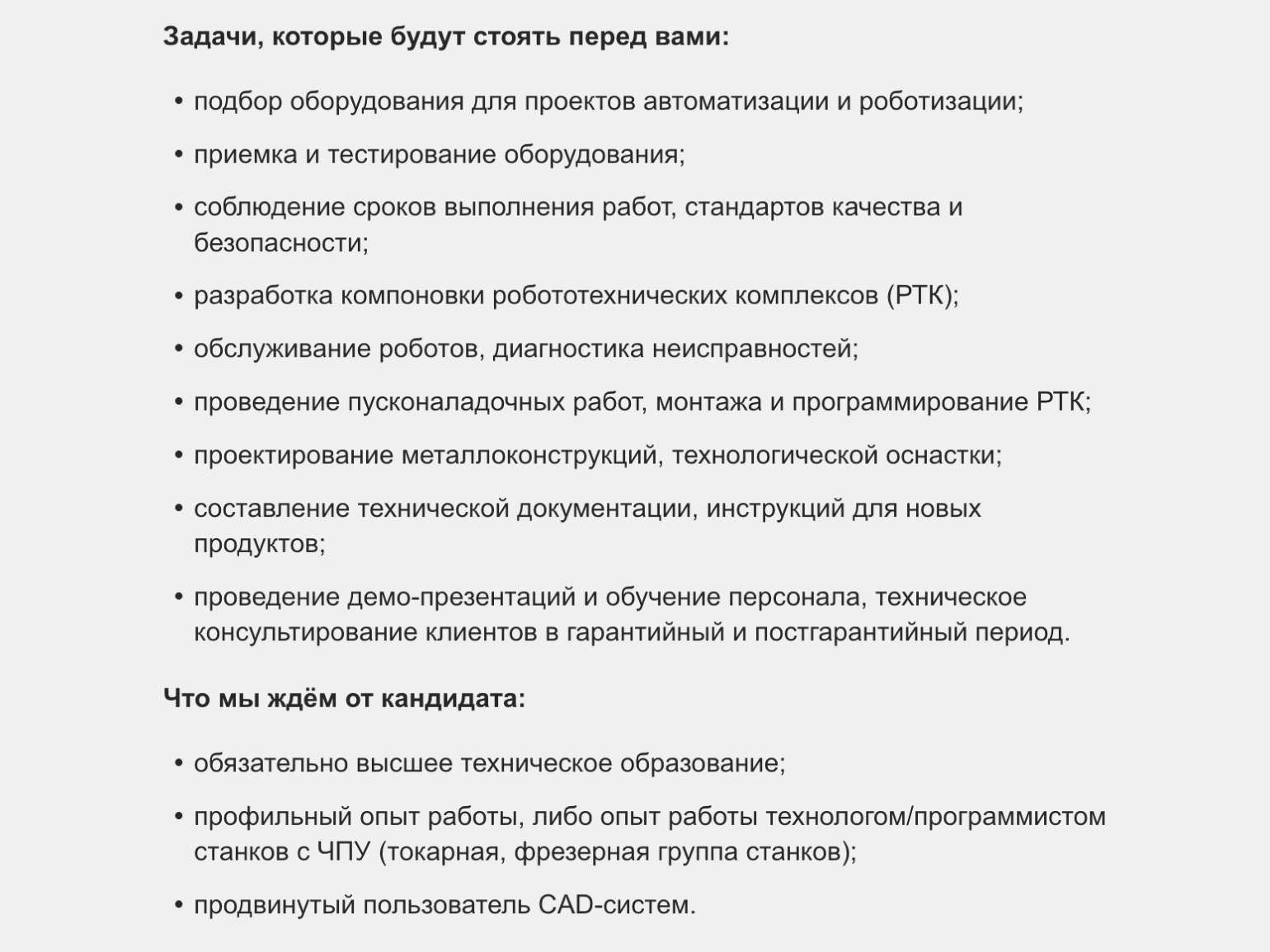 Решение проблем. Способность оперативно находить причины сбоев и предлагать рабочие решения. Поскольку многие ошибки возникают на стыке кода, электроники и механики, инженеру необходимо последовательно проверять гипотезы и тестировать различные варианты исправления.