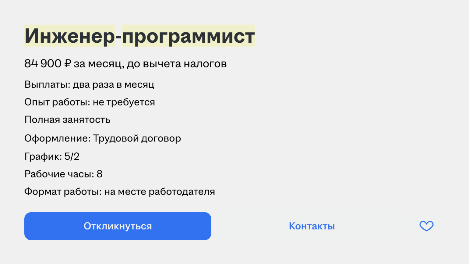 Заработок программных инженеров, по данным «HH Карьеры», в первую очередь зависит от их опыта. Начинающие специалисты могут рассчитывать в среднем на 85 000–100 000 рублей. Инженеры уровня middle — на 135 000–150 000 тысяч рублей. Senior-специалисты с опытом от трёх лет получают в среднем от 185 000 рублей.