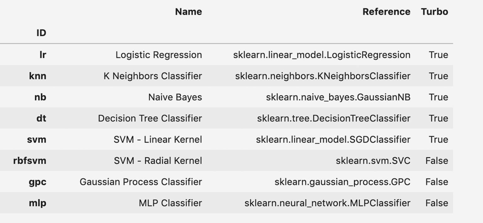 Для запуска модели используется модуль pycaret.classification. Процесс очень прост: нужно всего лишь вызвать функцию create_model(), принимающую в качестве параметра имя модели. Полный список поддерживаемых моделей и их имён тоже есть на сайте PyCaret, либо можно просмотреть его после импорта соответствующего модуля: