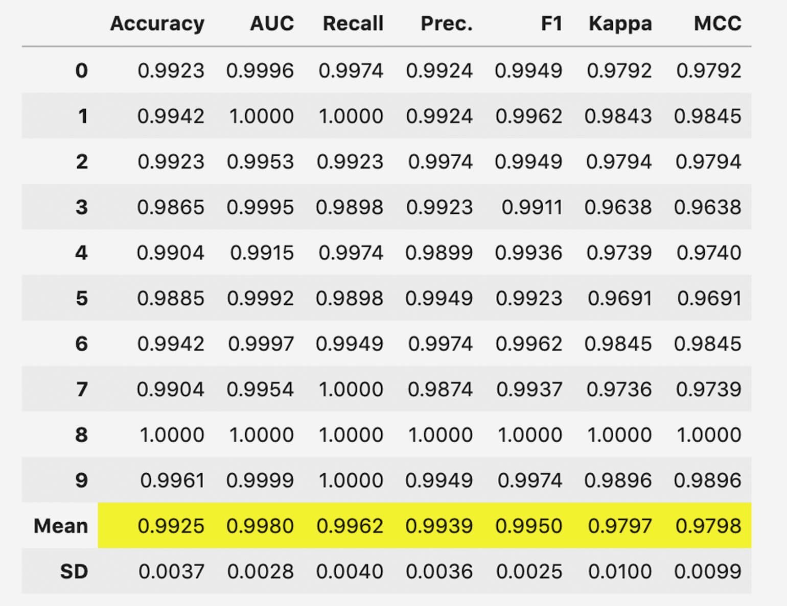 rf_model = create_model('rf')Как только все используемые параметры указаны верно, нажимаем Enter. Модель обработает данные и отобразит сетку результатов.