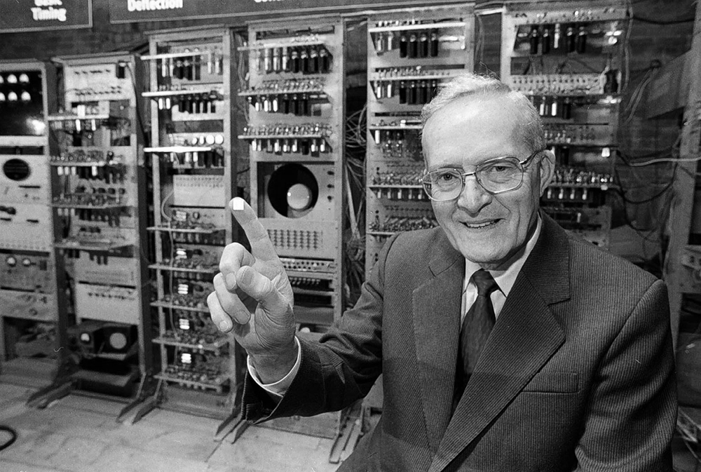 Том Килберн с современным компьютерным чипом на пальце. На заднем плане — Малая экспериментальная машина, созданная Килберном в 1948 году