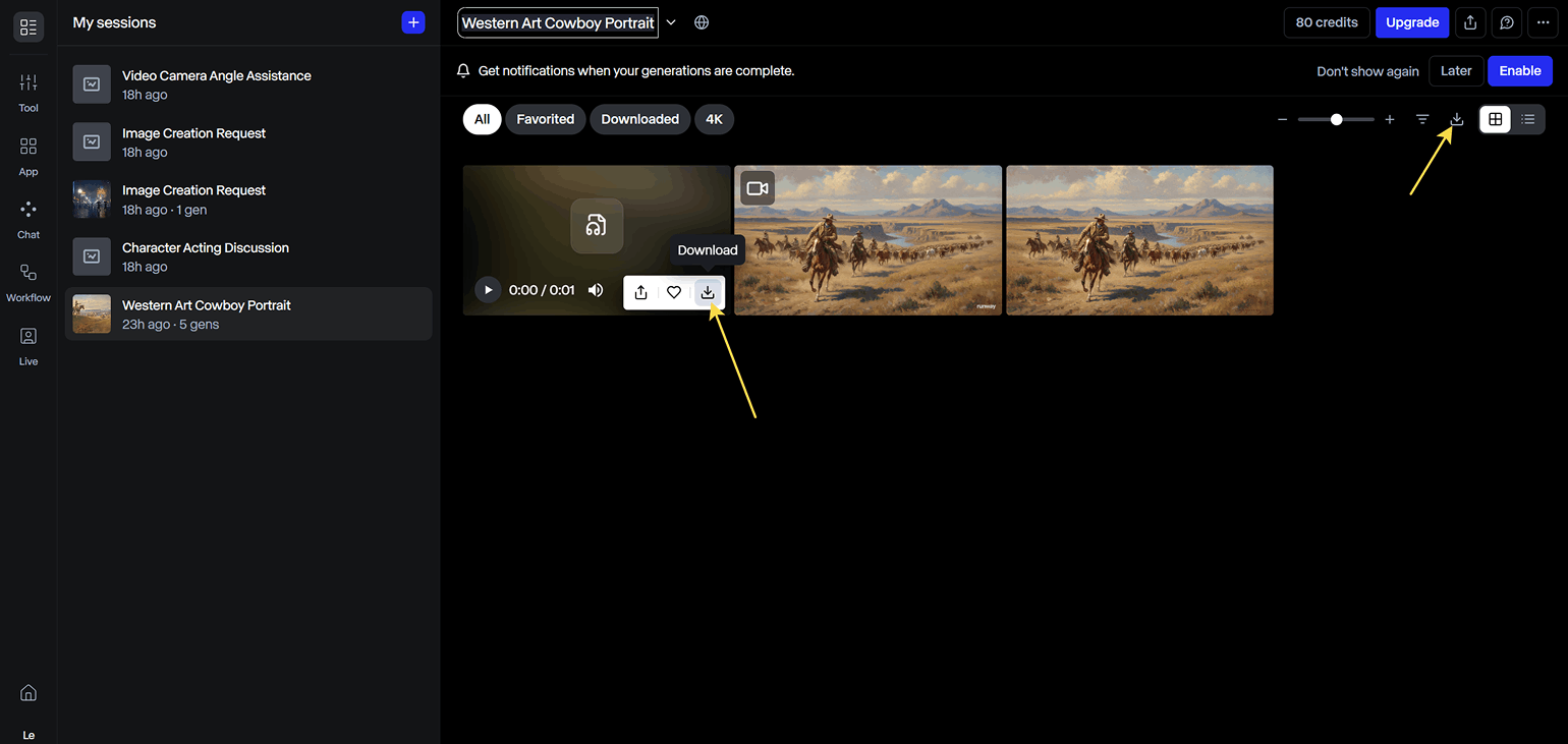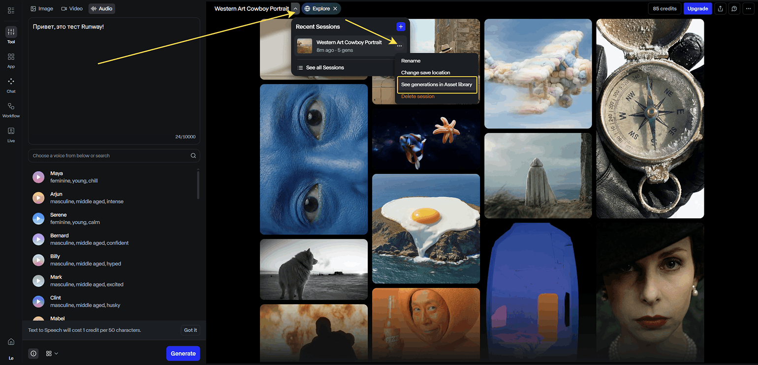 Сгенерированные в Runway материалы можно найти в Asset Library — библиотеке контента. Чтобы открыть её, нажмите на вкладку с вашей сессией, далее — на три точки и выберите пункт See generations in Asset Library.