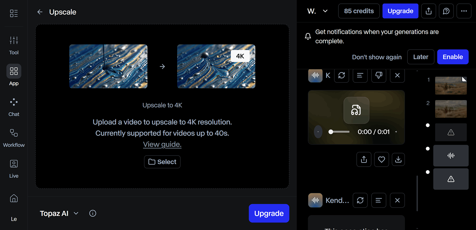 Upscale увеличивает разрешение видео. Поддерживаются разные варианты, включая 4K. Продолжительность видео не должна превышать 40 секунд.