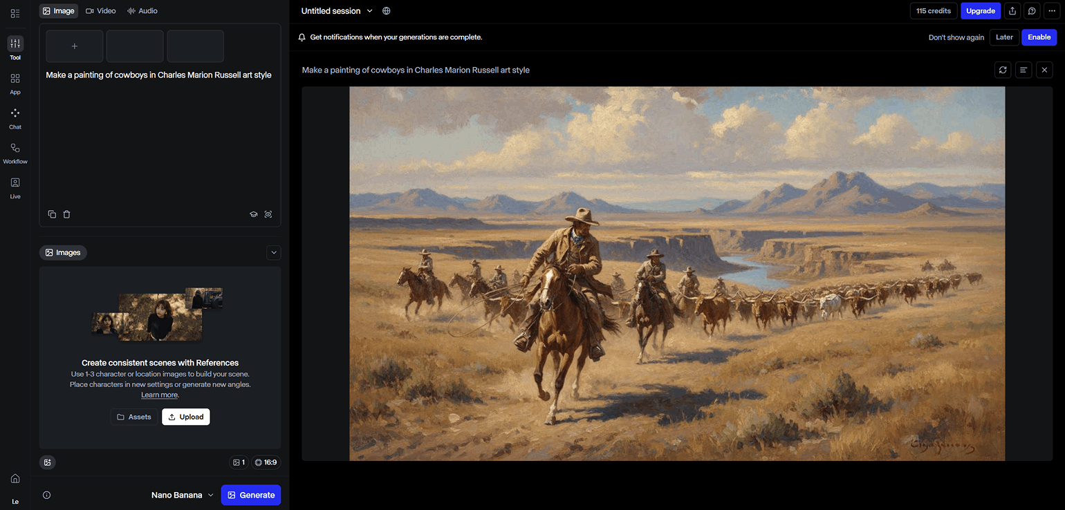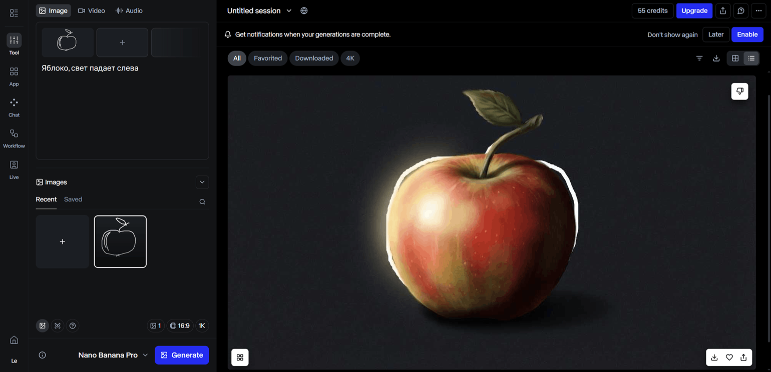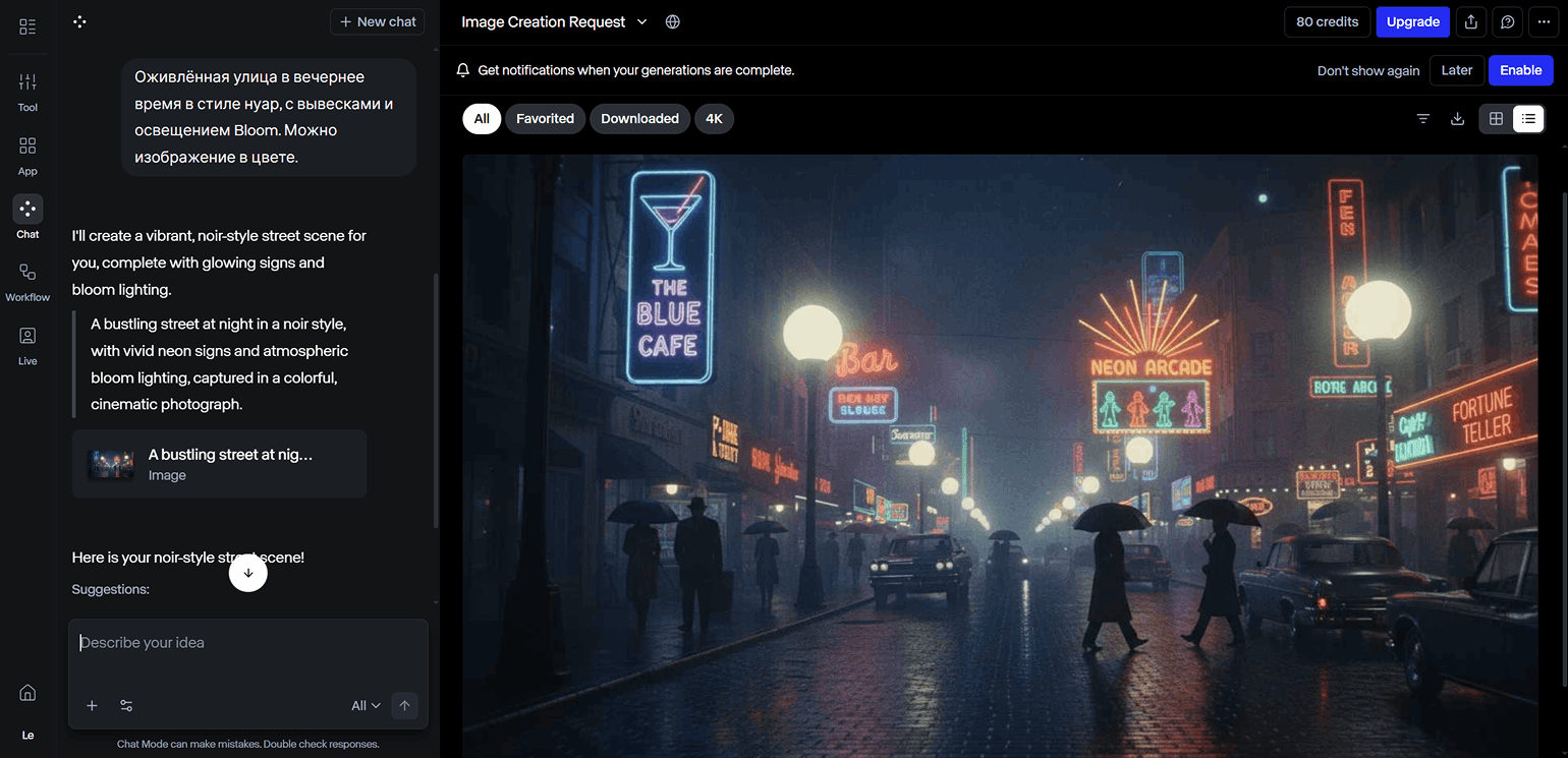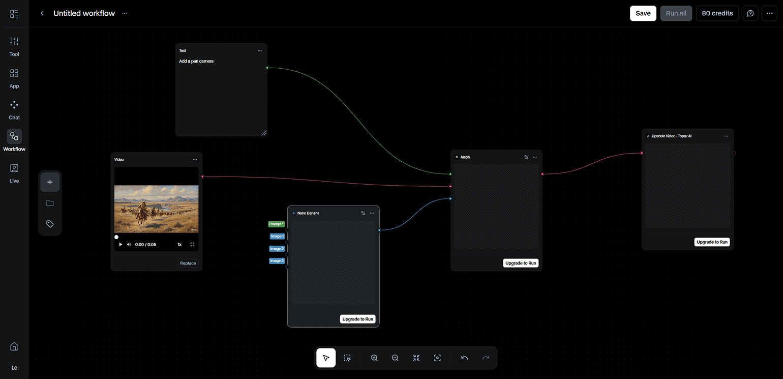 • Возможность комбинировать разные модели для создания контента. Можно выстраивать цепочку из промптов, референсов и разных ИИ-инструментов, чтобы получить лучший результат или автоматизировать обработку контента.