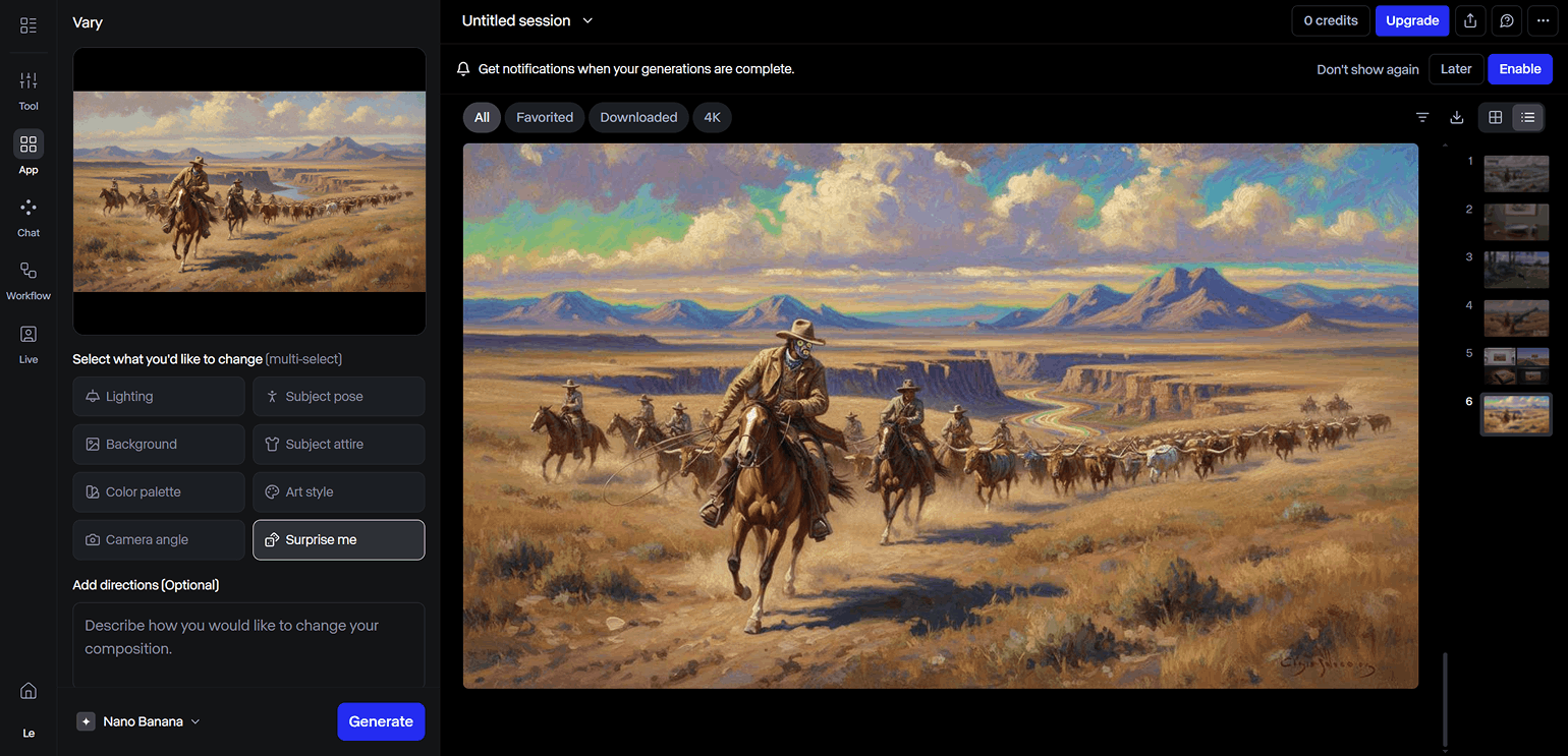 Vary заменяет детали на изображении — от освещения и фона до объектов съёмки. Аналогично работает инструмент Vary Ad, который подойдёт для работы с промоматериалами.