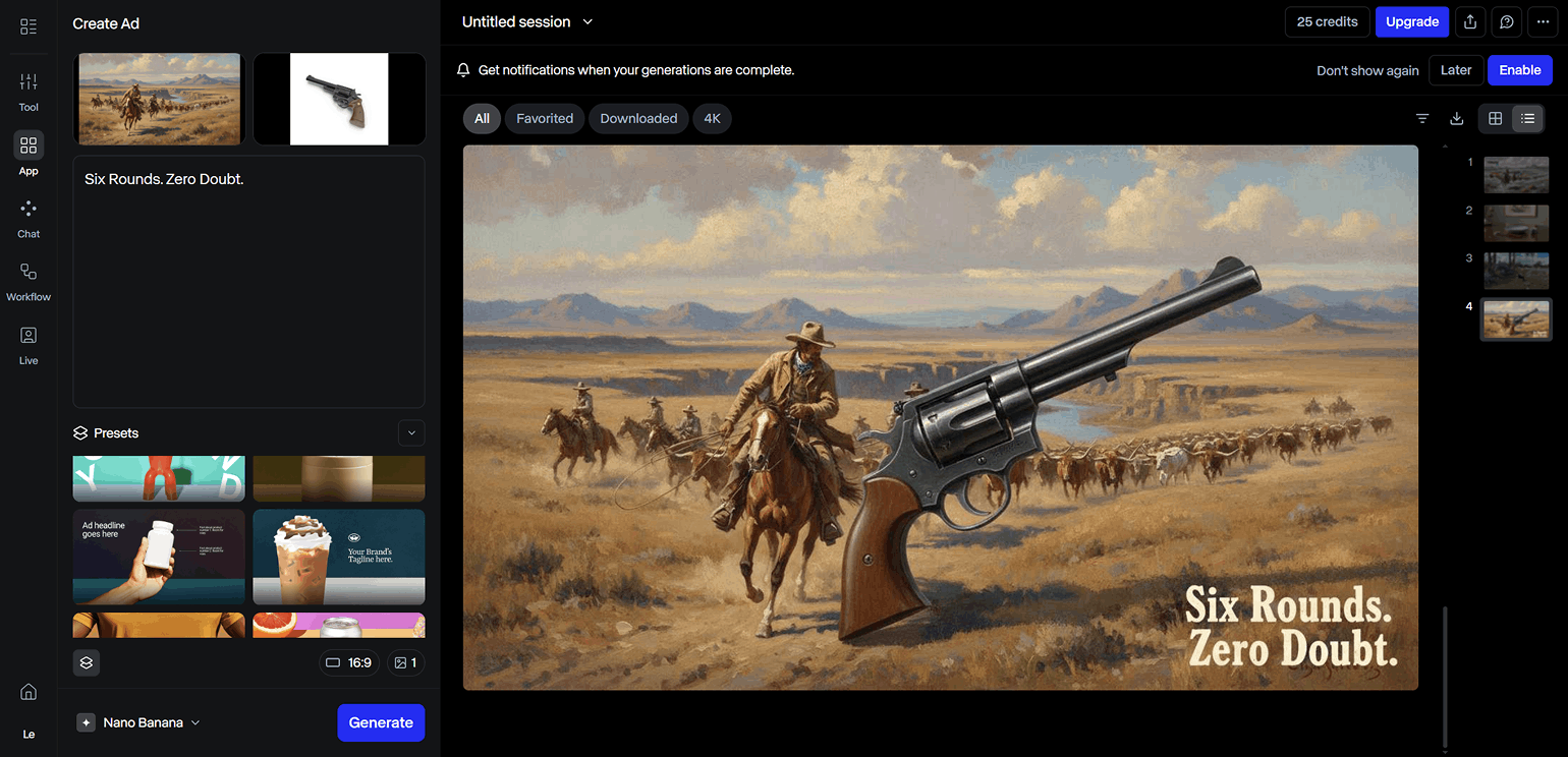 Create Ad используется для генерации баннеров и других промоматериалов. Пользователям доступно десять готовых пресетов для рекламы различных вариантов продукции, например напитков или аксессуаров.