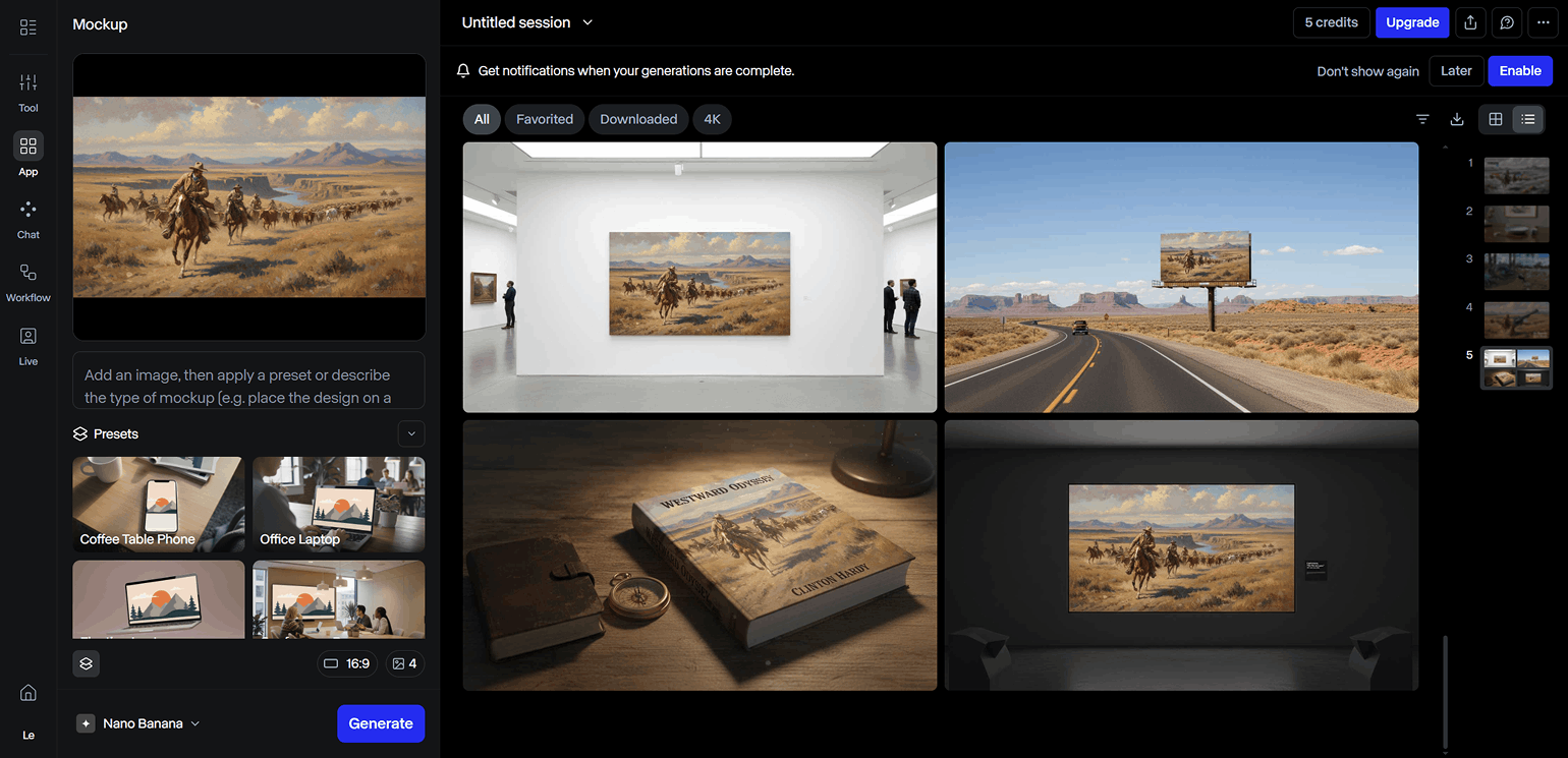 Mockup — инструмент для «примерки» дизайна на различные объекты и окружение. В Runway доступно много готовых пресетов — от одежды до муралов в стиле мозаики. Если не выбрать шаблон, то нейросеть создаст мокапы на своё усмотрение.