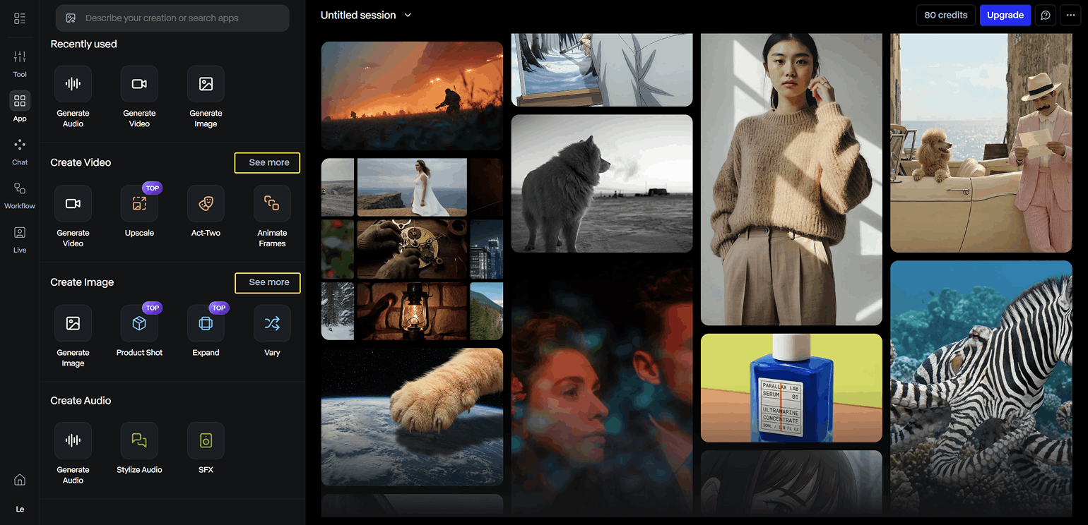 В левой верхней части рабочего пространства можно выбрать один из трёх режимов генерации — изображение (Image), видео (Video) и аудио (Audio). Они дублируются в разделах Tool и App.
