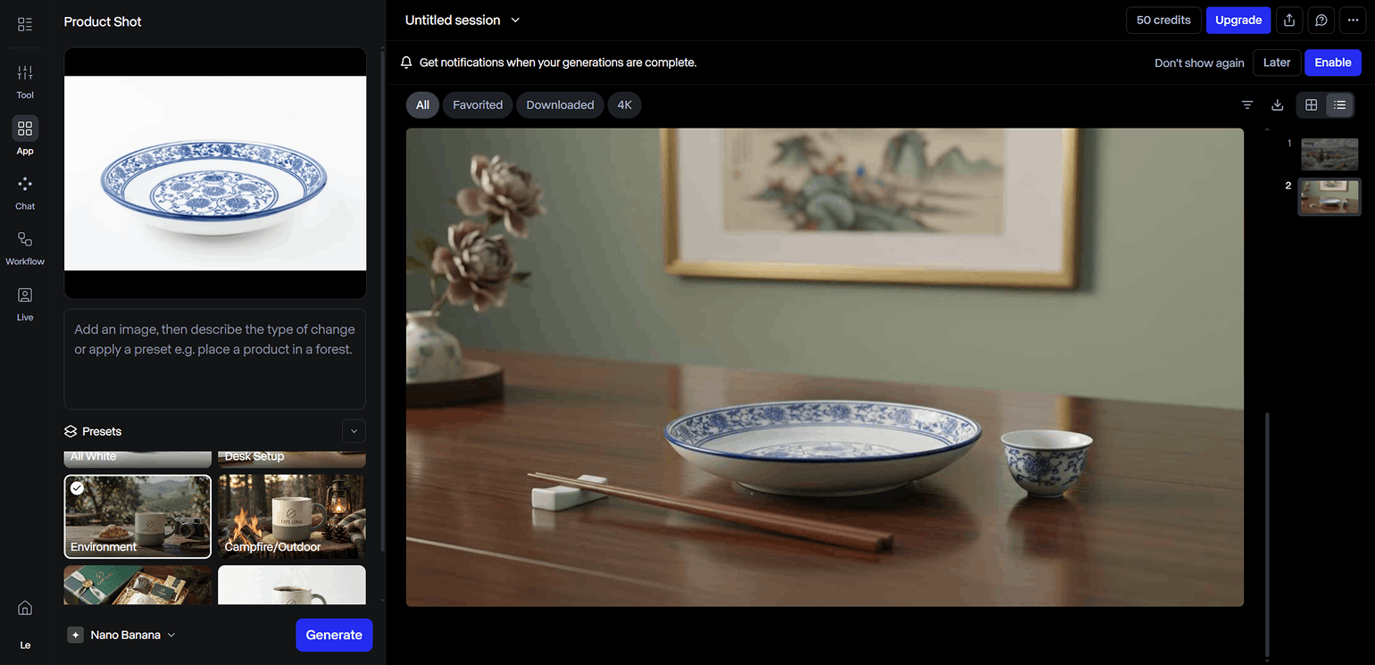 Product Shot позволяет создать изображение с конкретным предметом в реалистичном окружении. Инструмент подойдёт тем, кто хочет получить фотографию какого-либо товара или изделия, но не готов проводить реальную фотосъёмку.