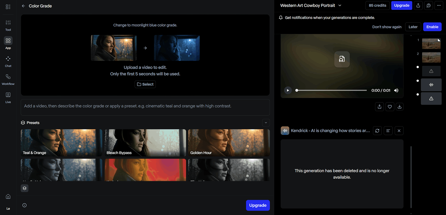 Color Grade — инструмент для цветокоррекции видео. Можно использовать готовые пресеты или написать инструкцию в промпте.