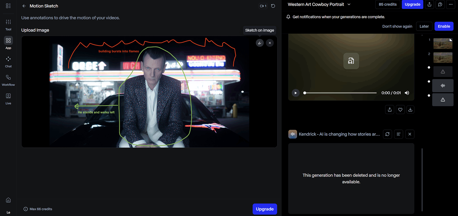 Motion Sketch — инструмент генерации видео по изображению с комментариями пользователя. Пометки на кадре делаются с помощью инструмента Sketch on Image.