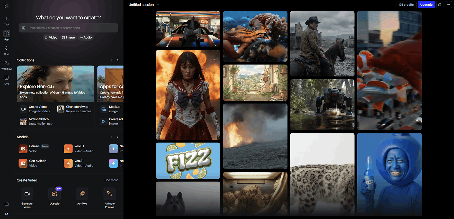 Бесплатный тариф даёт доступ к устаревшим моделям, например Gen-4 Turbo или Gemini 3 Pro, и ограниченному набору инструментов для работы с изображениями и видео. Кроме того, пользователь получает всего 125 кредитов на любые действия. Этого количества хватит на создание 20–30 изображений или 5–10 коротких видео. Лимит обновляется раз в месяц.