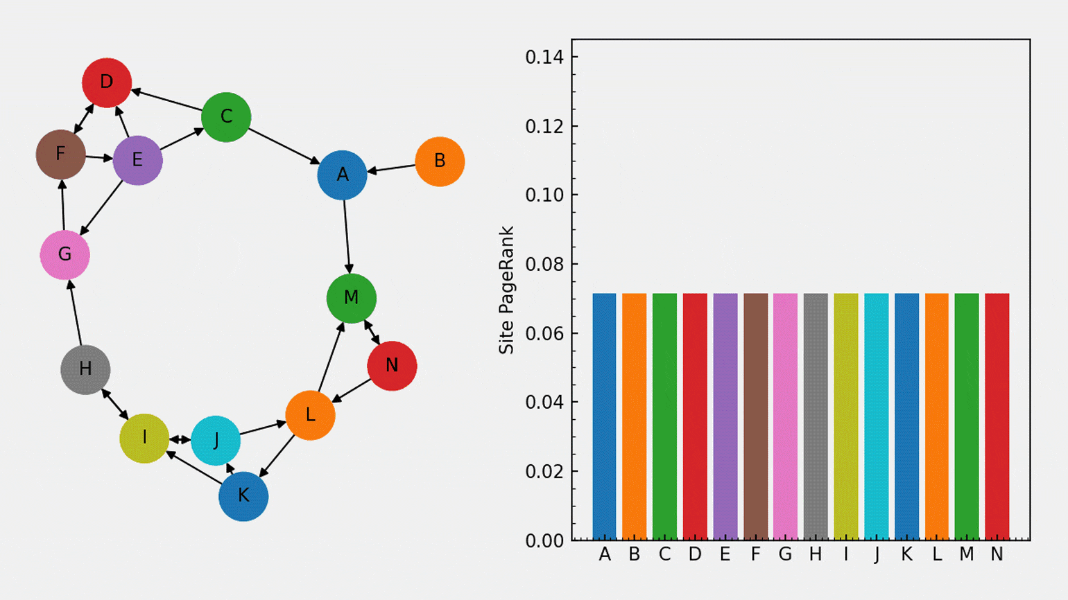Визуализация работы алгоритма PageRank. Размер узлов показывает важность страницы, стрелки — гиперссылки между страницами. Чем больше авторитетных страниц ссылается на конкретную страницу, тем выше её ранг