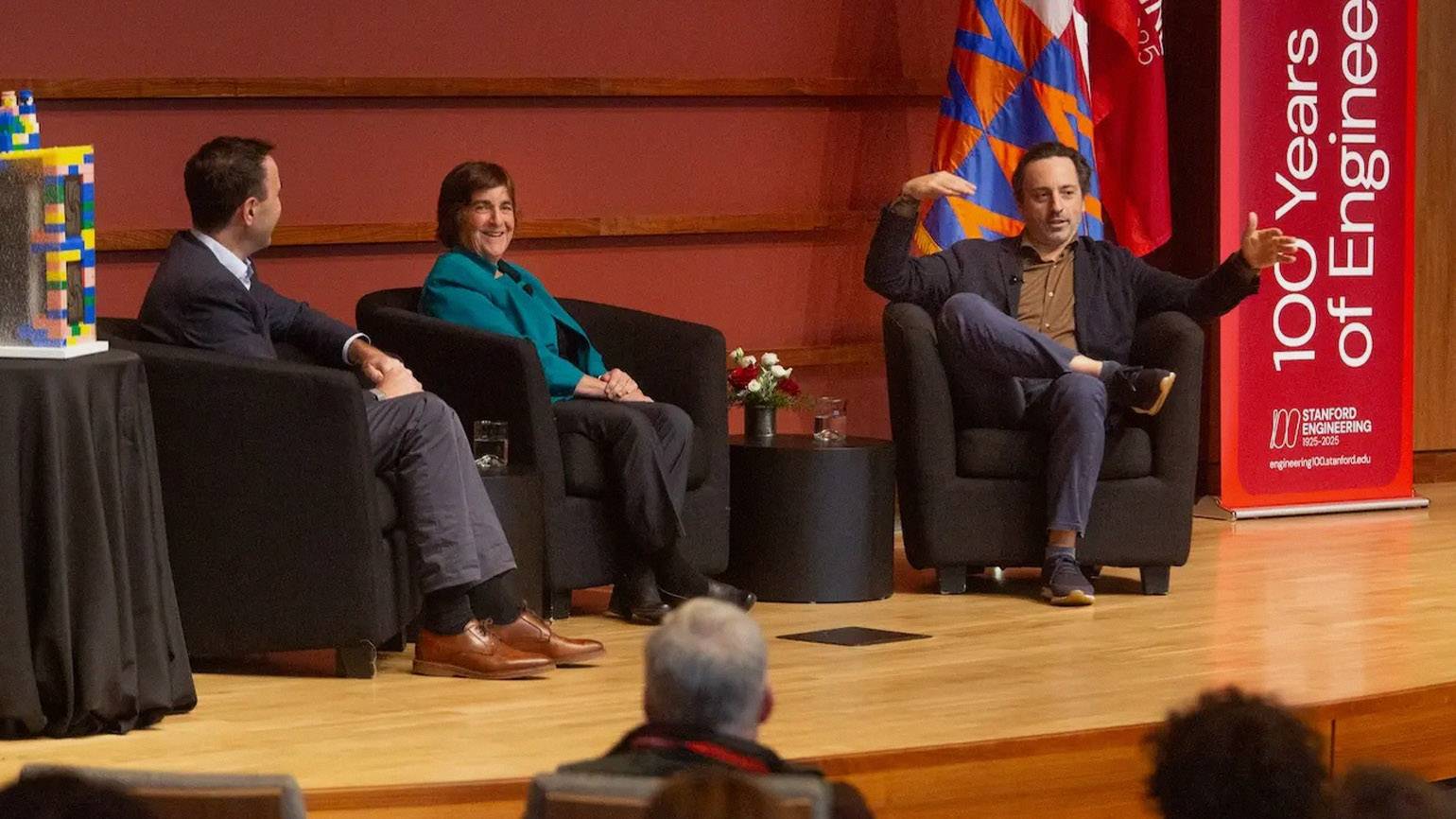Джонатан Левин, Дженнифер Уидом и Сергей Брин в Стэнфорде, 2025 год