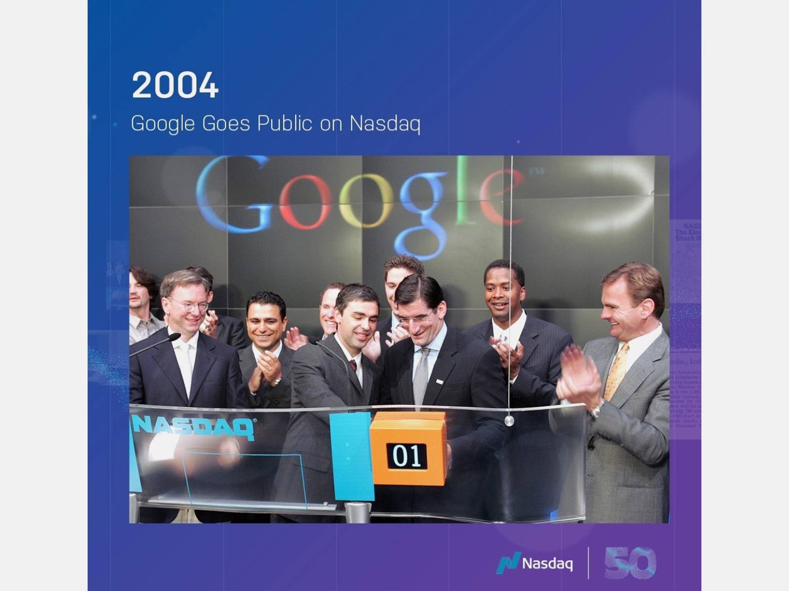 Церемония листинга Google на бирже NASDAQ 19 августа 2004 года