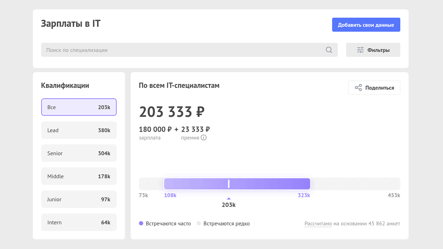 Для медианы все значения зарплат располагают по возрастанию и берут значение посередине ряда. Половина получает ниже этого значения, а половина — выше. По данным зарплатного калькулятора «Хабр Карьеры», медианный доход программиста в России на момент написания статьи составляет 203 тысячи рублей. Если говорить о грейдах, то данные будут такие: