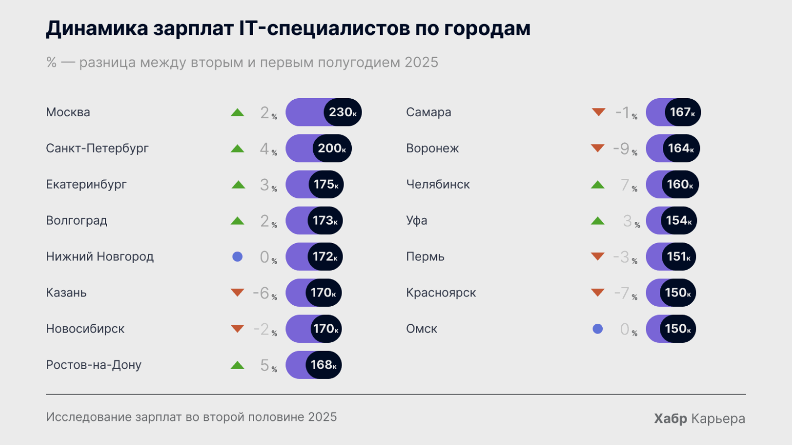 По данным исследования «Хабр Карьеры» за вторую половину 2025 года, медианная зарплата IT-специалистов в Москве составляет 230 тысяч рублей. В отличие от данных из вакансий, это исследование основано на реальных окладах: пользователи анонимно вводят свою зарплату в калькулятор платформы.