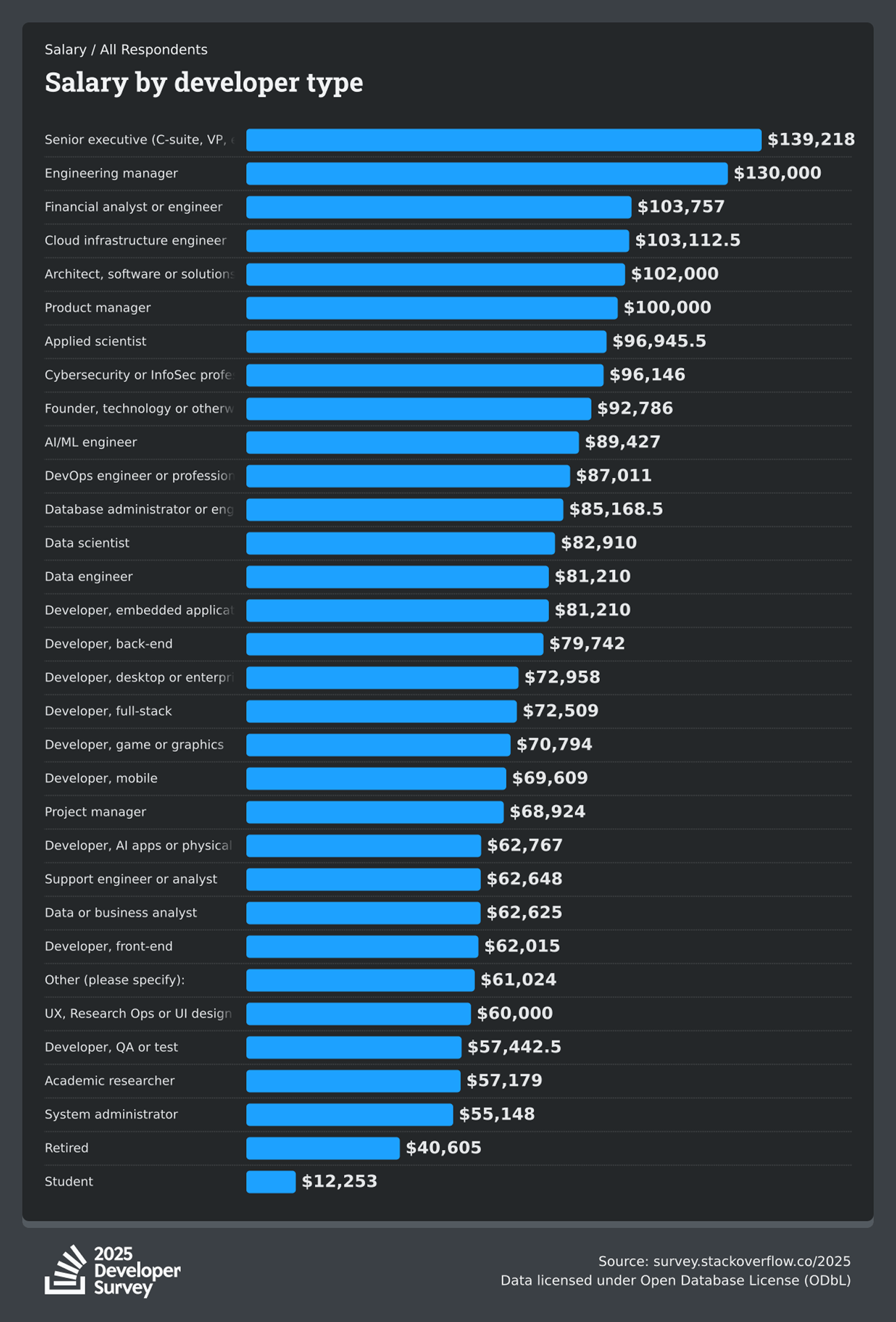 Stack Overflow ежегодно проводит опросы о работе и зарплатах программистов по всему миру. В 2025 году в исследовании участвовало более 49 тысяч специалистов из 177 стран. Разрыв в зарплатах между странами огромный: больше всего платят в США, меньше всего — в Индии.