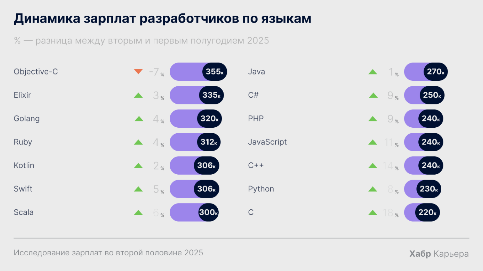 Также высокие зарплаты у разработчиков на Ruby (312 тысяч рублей), Kotlin и Swift (по 306 тысяч рублей), Scala (300 тысяч рублей). Эти языки востребованы в крупных компаниях и нужны для специфических задач.