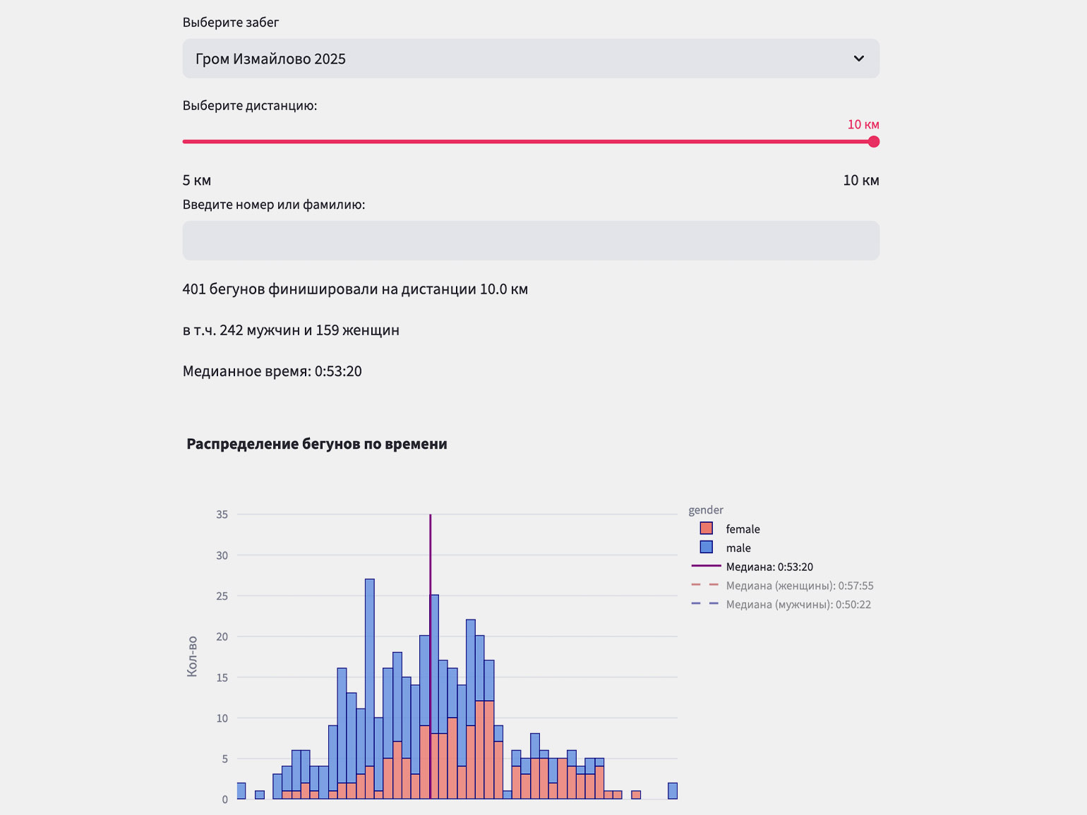 Я спарсила результаты нескольких массовых забегов, построила диаграммы, отметила медиану, добавила поиск по номеру и фамилии. Теперь этим сайтом пользуются наши друзья-бегуны.