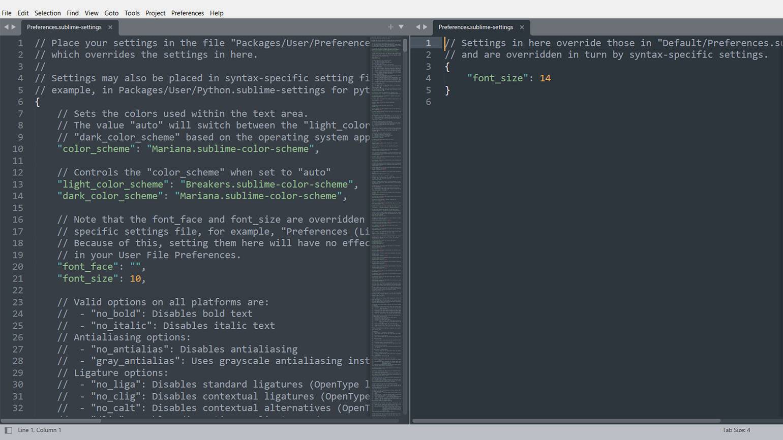 - Preferences → Settings → Default — настройки редактора по умолчанию.