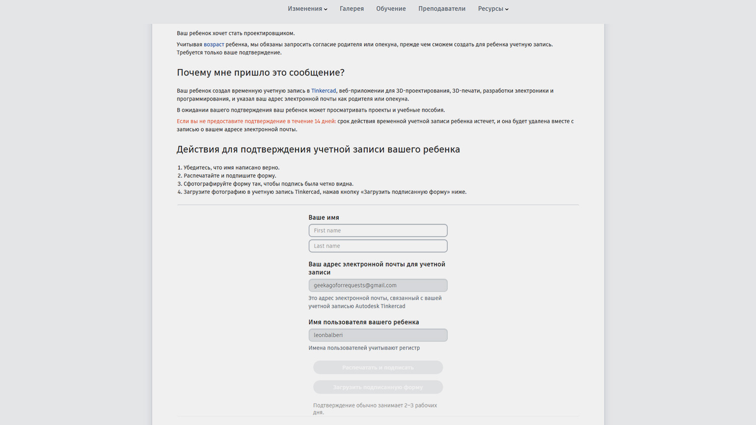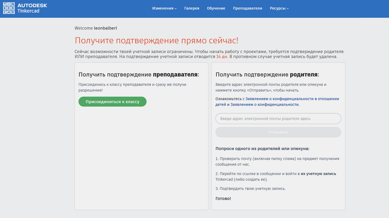 Ещё нюанс регистрации: Tinkercad создаёт учётные записи только для пользователей от 13 лет. В остальных случаях сервис выдаёт временную учётку на 14 дней, которую должен подтвердить родитель или преподаватель. Процедура занимает 2–3 рабочих дня, поэтому проще завести аккаунт на себя и затем передать его ребёнку.
