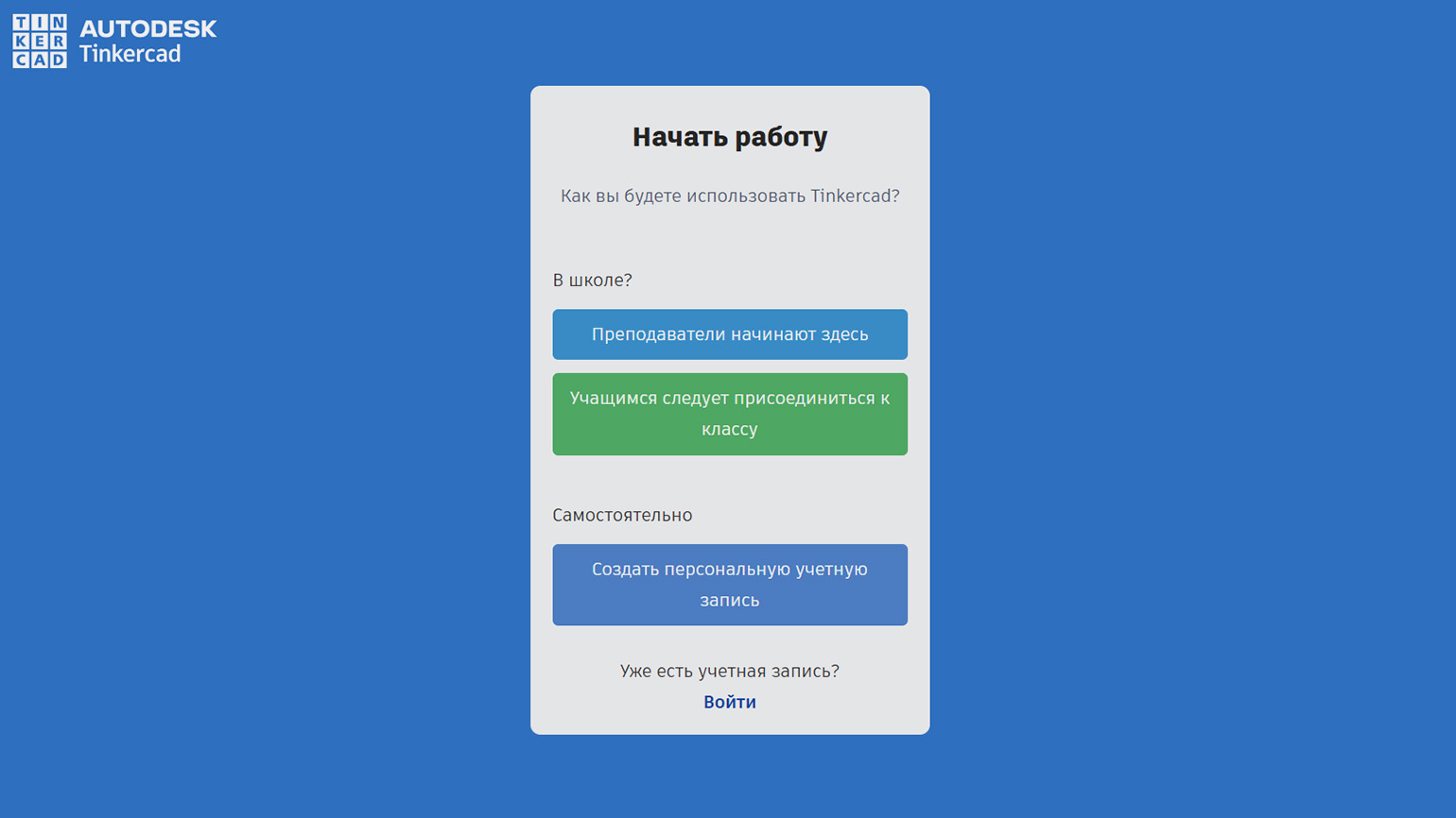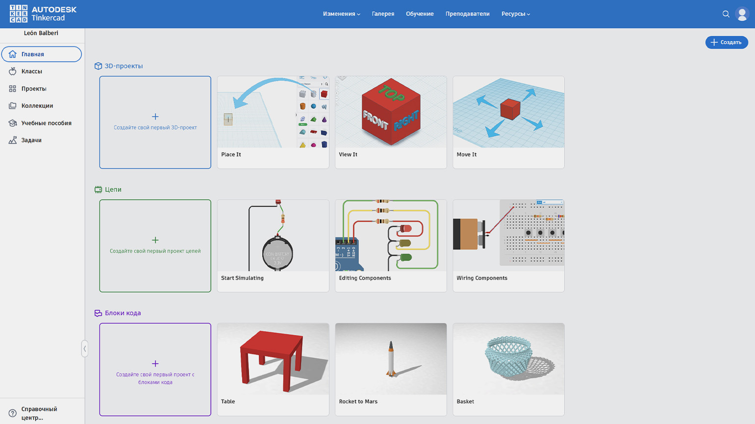После входа в учётную запись перед вами откроется главная страница, где можно выбрать один из рабочих режимов: «3D-проекты», «Цепи» или «Блоки кода». Здесь же вам доступны интерактивные уроки, которые можно пройти заранее, чтобы изучить все основные операции в Tinkercad.
