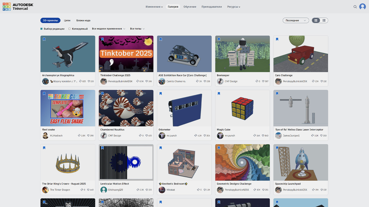 - «Галерея» — это подборка лучших работ сообщества Tinkercad, которые вы можете взять как шаблон для своего проекта.