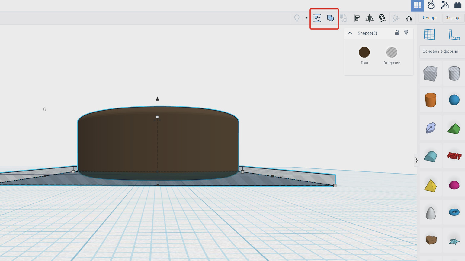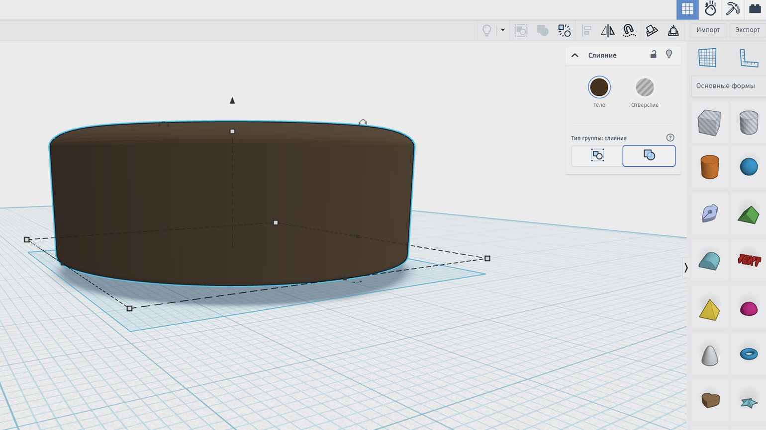 Нам нужно сделать низ цилиндра плоским и отсечь его дно. Для этого выделите обе фигуры и нажмите на кнопку «Создать группу слияния» — нижняя часть цилиндра удалится, и останется ровная поверхность.